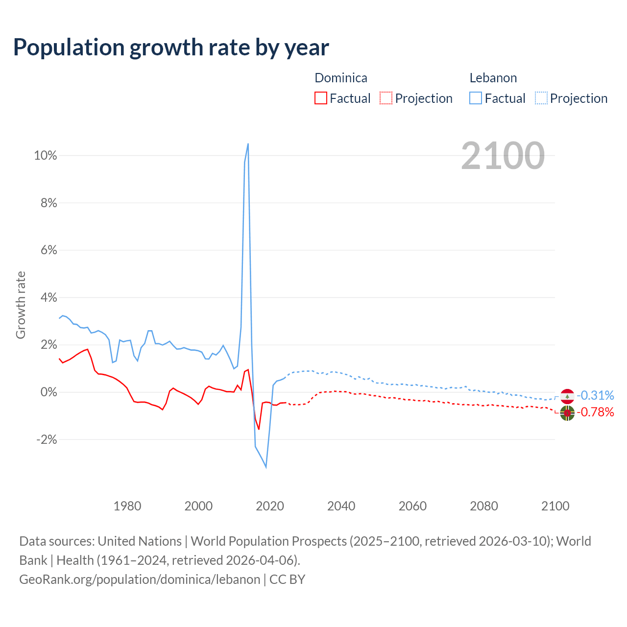 - For the last 10 years, Dominica has had an average growth rate of -0.47% per year vs +0.16% in Lebanon.