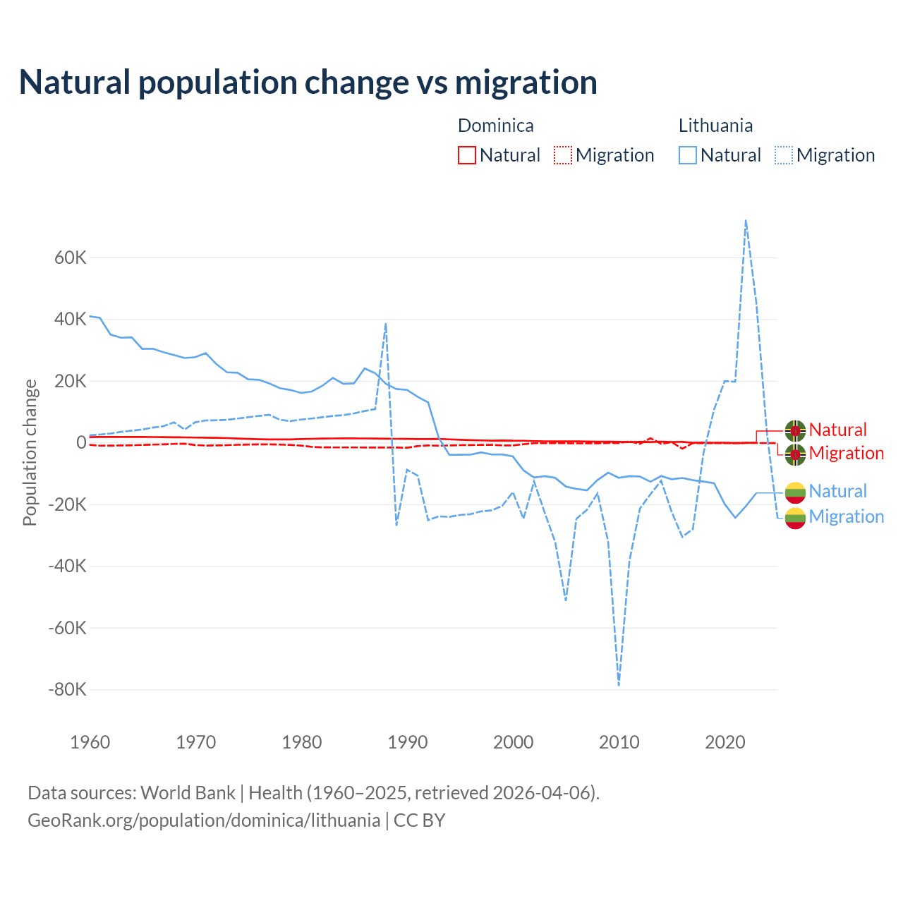Over the last 10 years, 4.63% of the population change in Dominica is from natural causes (a loss of 190 people) and 95.4% is from migration (a loss of 3,914 people). In Lithuania 68.7% is from natural causes (a loss of 153,859 people) and 31.3% is from migration (a gain of 70,196 people).