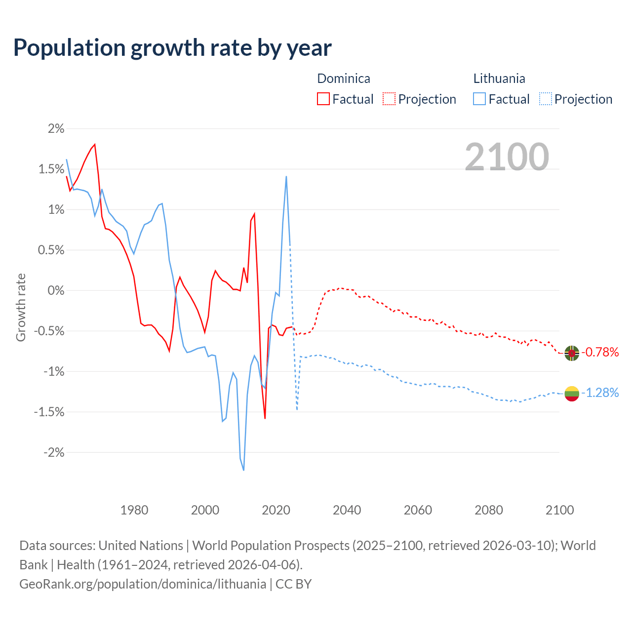 - For the last 10 years, Dominica has had an average growth rate of -0.47% per year vs -0.22% in Lithuania.