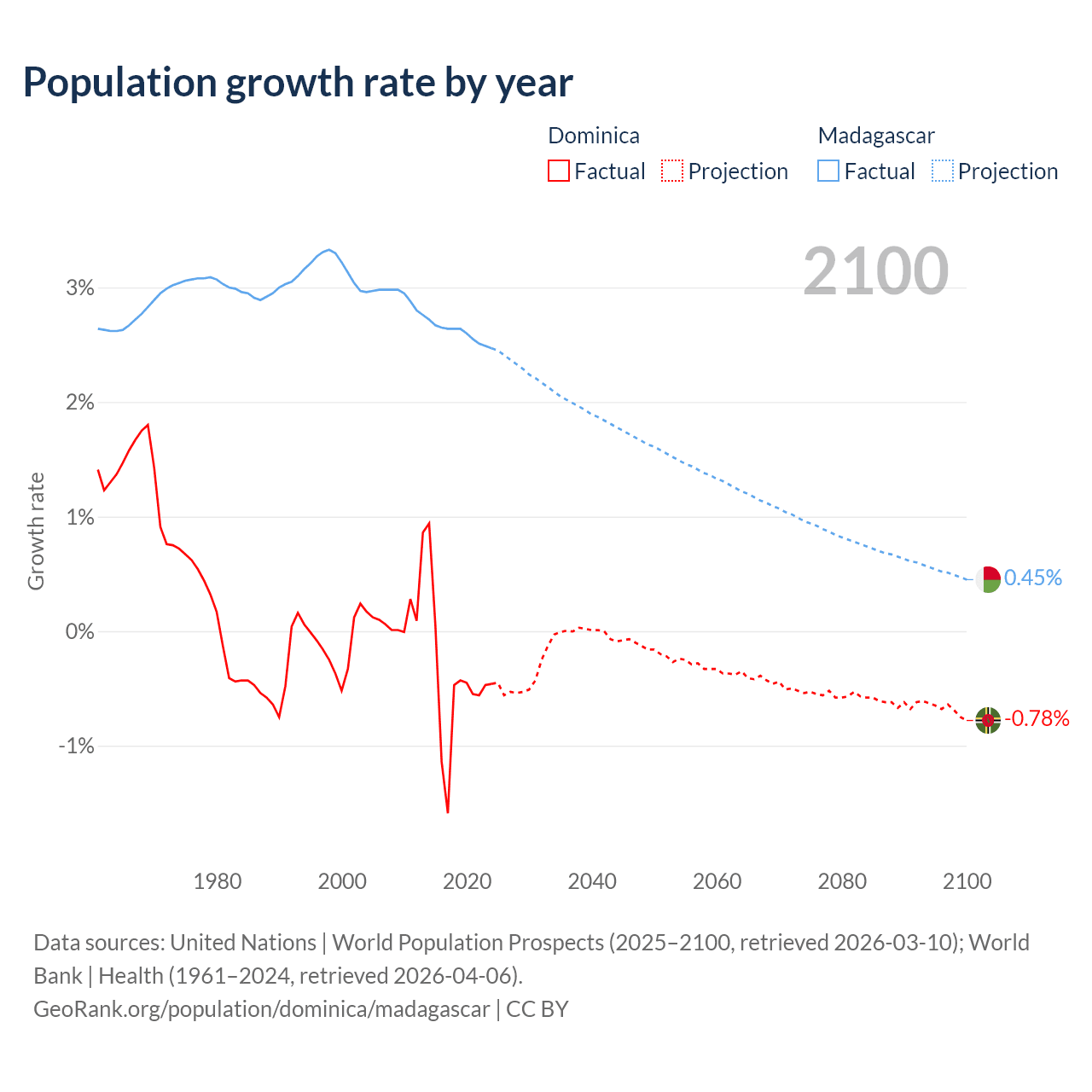 - For the last 10 years, Dominica has had an average growth rate of -0.47% per year vs +2.6% in Madagascar.