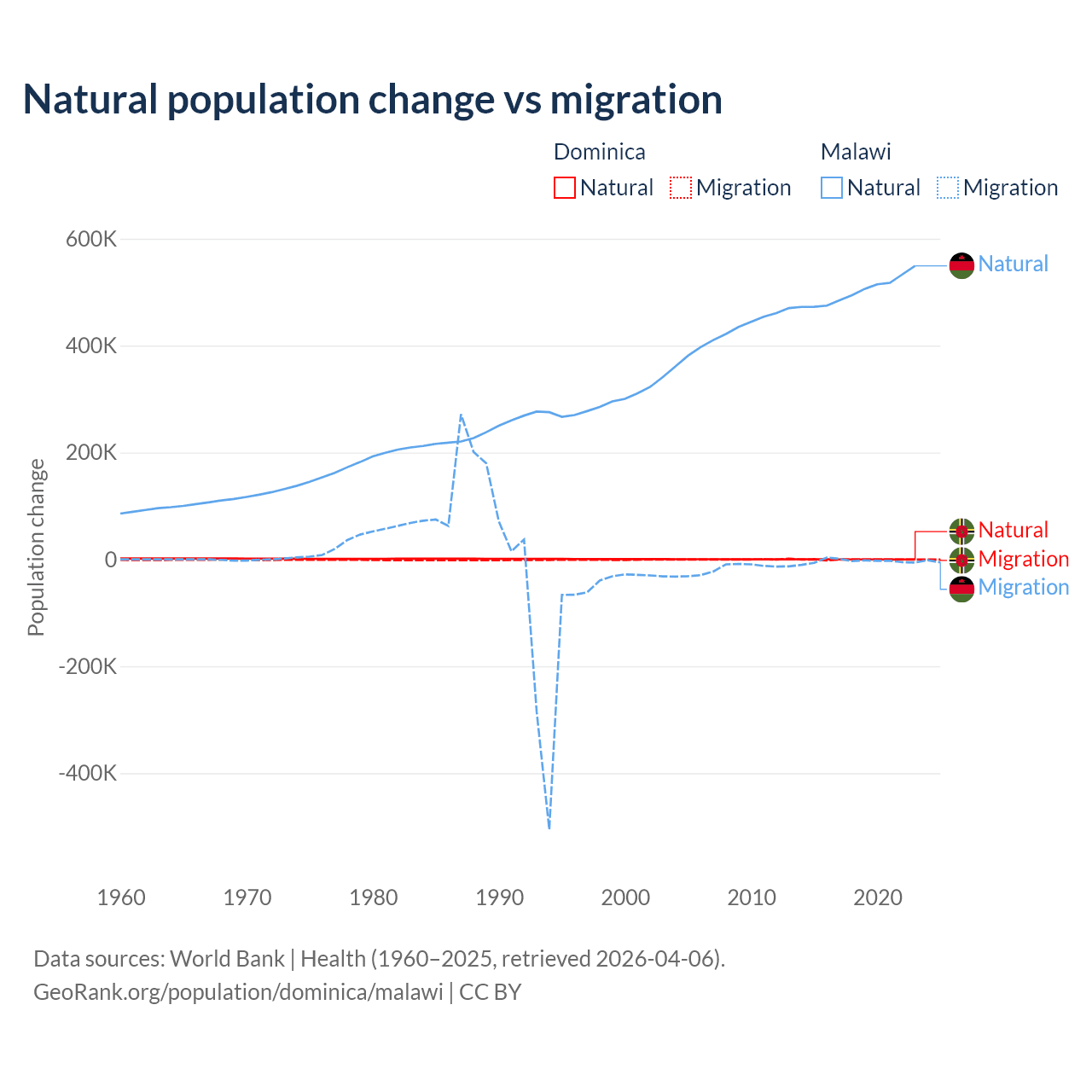 Over the last 10 years, 4.63% of the population change in Dominica is from natural causes (a loss of 190 people) and 95.4% is from migration (a loss of 3,914 people). In Malawi 99.3% is from natural causes (a gain of 5,019,393 people) and 0.67% is from migration (a loss of 33,768 people).