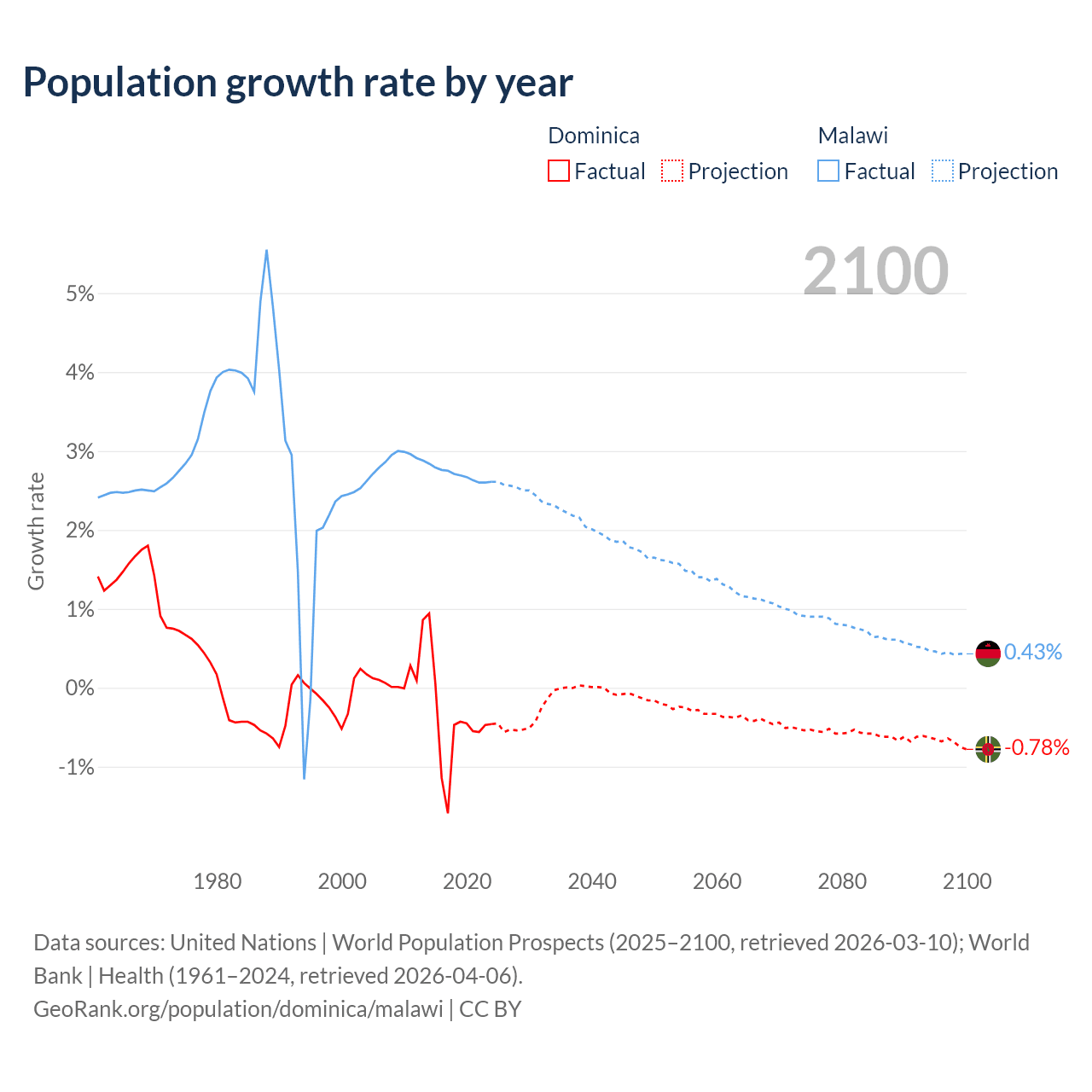 - For the last 10 years, Dominica has had an average growth rate of -0.47% per year vs +2.7% in Malawi.
