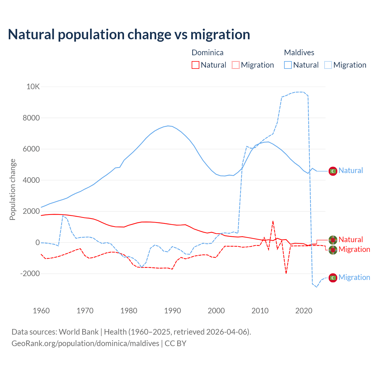 Over the last 10 years, 4.63% of the population change in Dominica is from natural causes (a loss of 190 people) and 95.4% is from migration (a loss of 3,914 people). In Maldives 42.7% is from natural causes (a gain of 51,342 people) and 57.3% is from migration (a gain of 68,788 people).