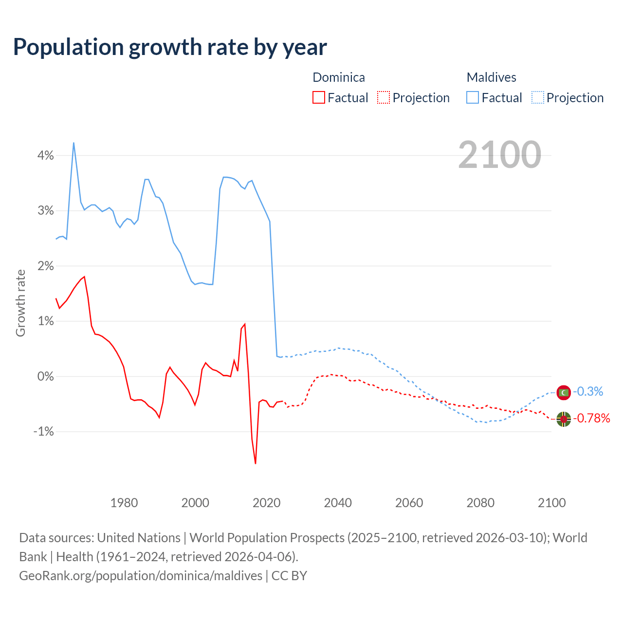 - For the last 10 years, Dominica has had an average growth rate of -0.47% per year vs +2.56% in Maldives.