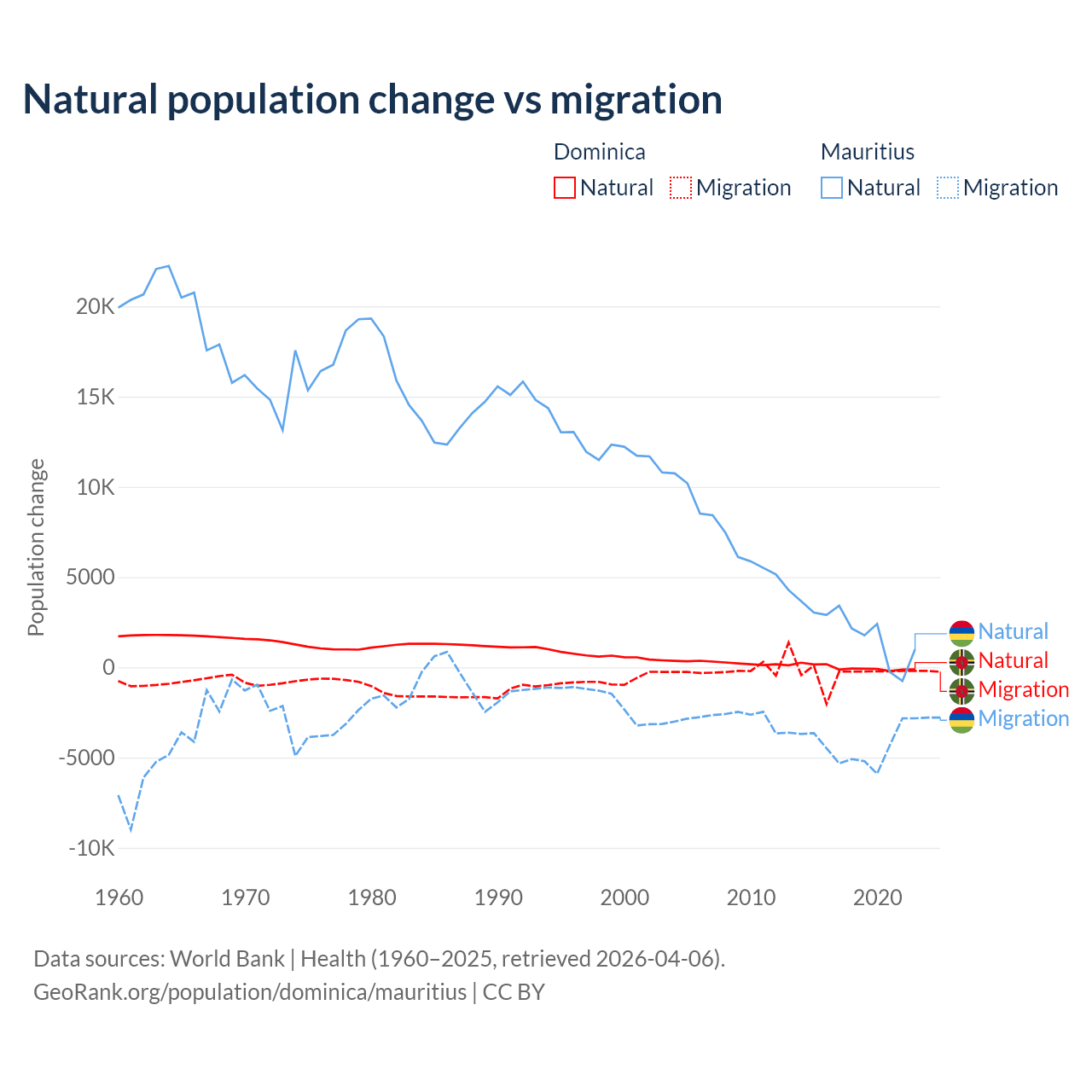Over the last 10 years, 4.63% of the population change in Dominica is from natural causes (a loss of 190 people) and 95.4% is from migration (a loss of 3,914 people). In Mauritius 30.9% is from natural causes (a gain of 19,327 people) and 69.1% is from migration (a loss of 43,294 people).