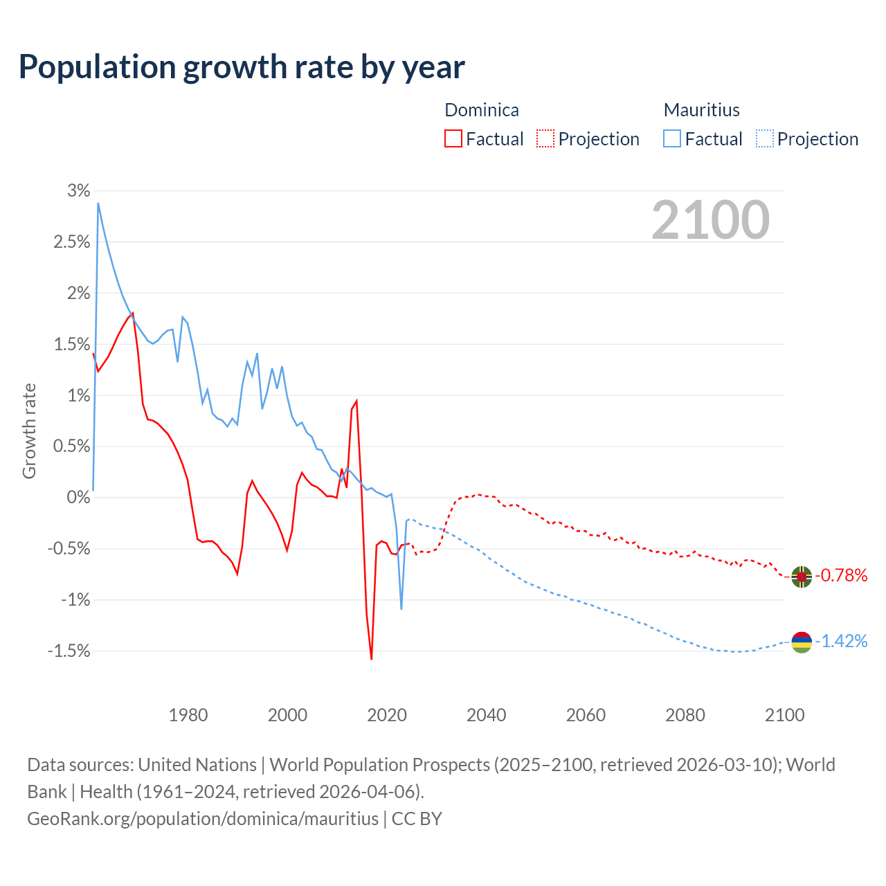 - For the last 10 years, Dominica has had an average growth rate of -0.47% per year vs -0.09% in Mauritius.