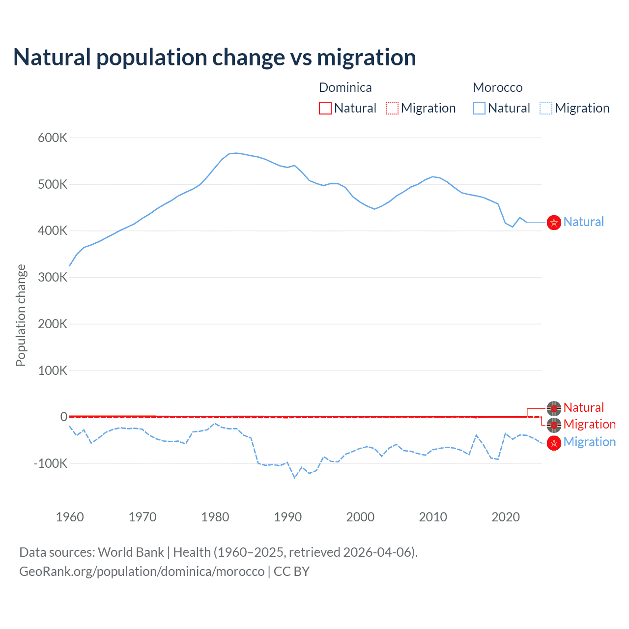 Over the last 10 years, 4.63% of the population change in Dominica is from natural causes (a loss of 190 people) and 95.4% is from migration (a loss of 3,914 people). In Morocco 88.3% is from natural causes (a gain of 4,495,223 people) and 11.7% is from migration (a loss of 594,083 people).