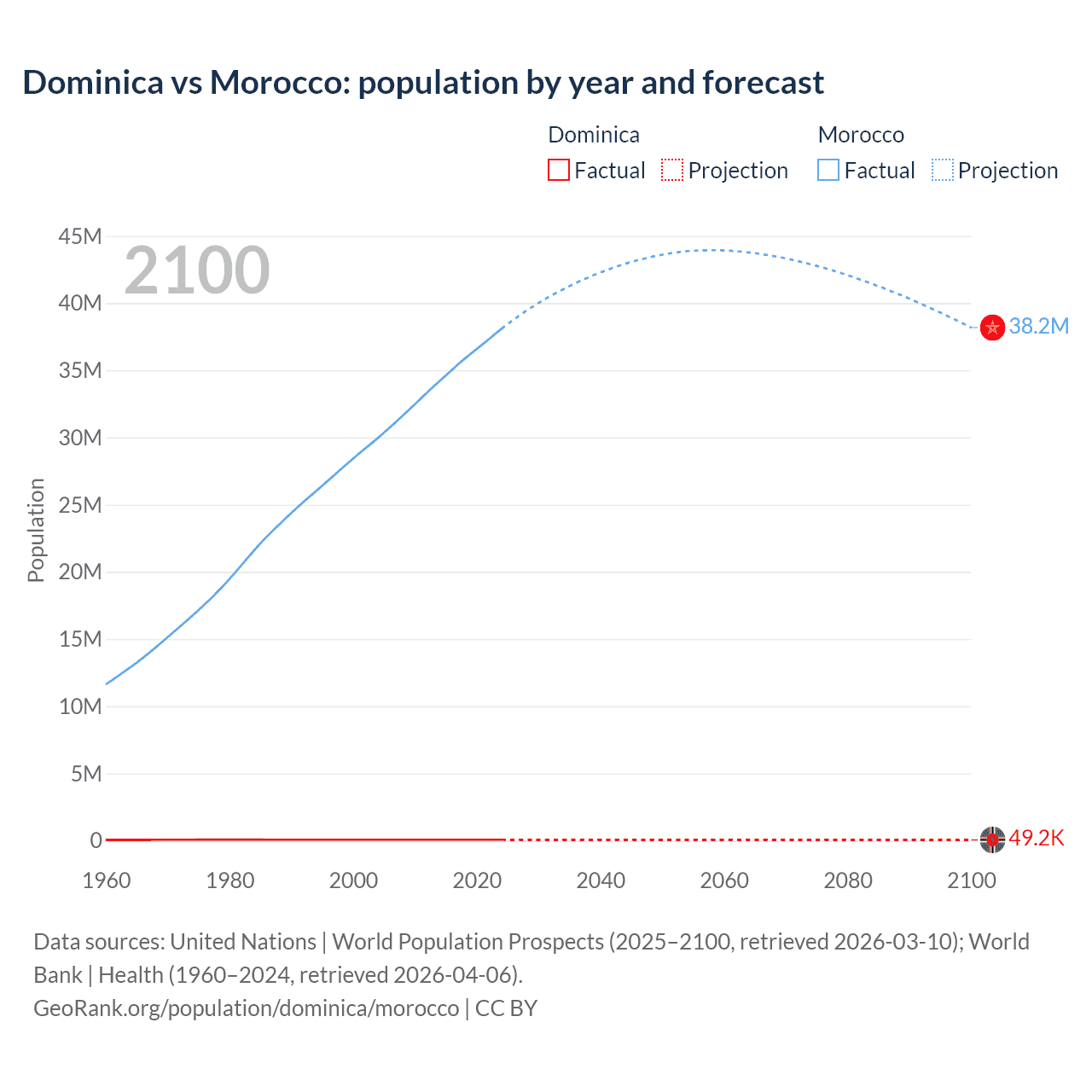 Dominica vs Morocco: population by year and forecast