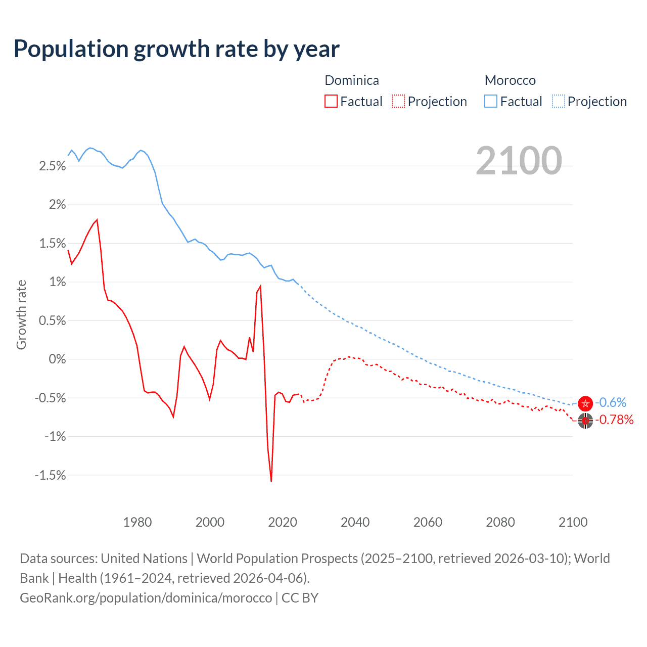 - For the last 10 years, Dominica has had an average growth rate of -0.47% per year vs +1.09% in Morocco.