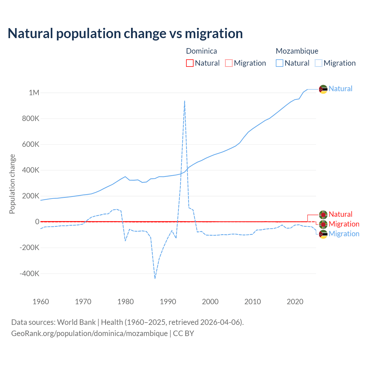 Over the last 10 years, 4.63% of the population change in Dominica is from natural causes (a loss of 190 people) and 95.4% is from migration (a loss of 3,914 people). In Mozambique 95.9% is from natural causes (a gain of 9,108,203 people) and 4.15% is from migration (a loss of 393,923 people).
