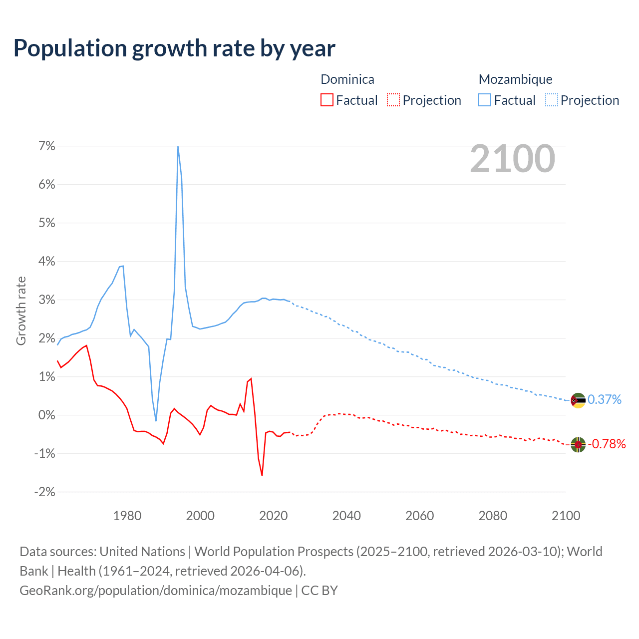 - For the last 10 years, Dominica has had an average growth rate of -0.47% per year vs +2.99% in Mozambique.