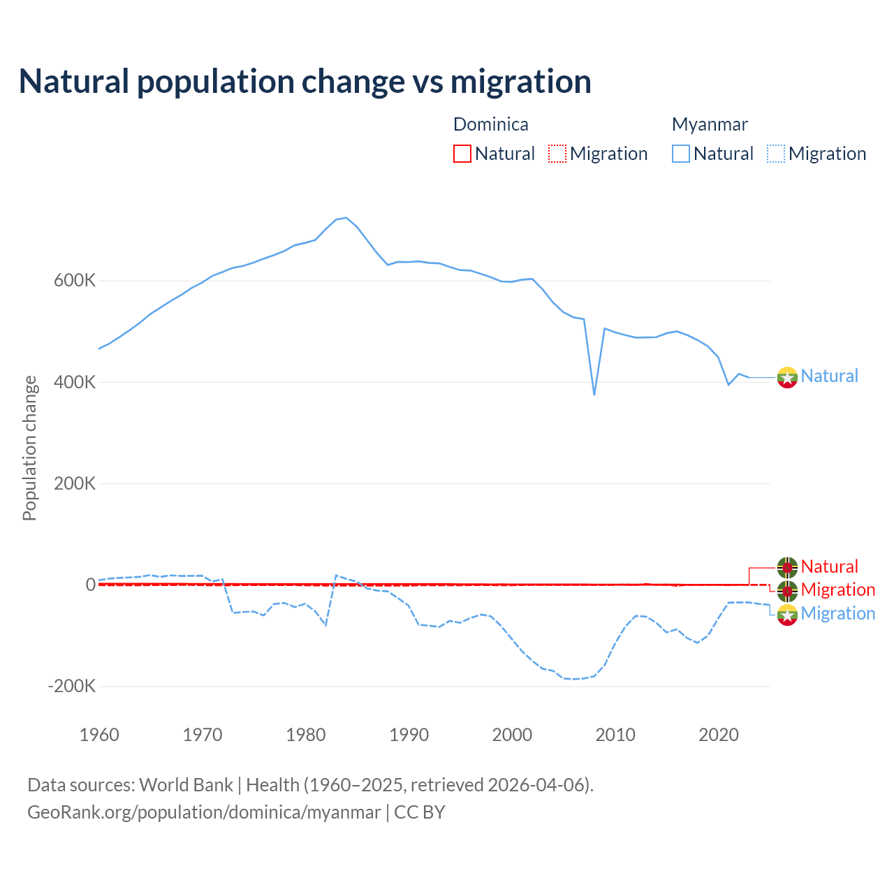 Over the last 10 years, 4.63% of the population change in Dominica is from natural causes (a loss of 190 people) and 95.4% is from migration (a loss of 3,914 people). In Myanmar 86% is from natural causes (a gain of 4,594,615 people) and 14% is from migration (a loss of 749,272 people).