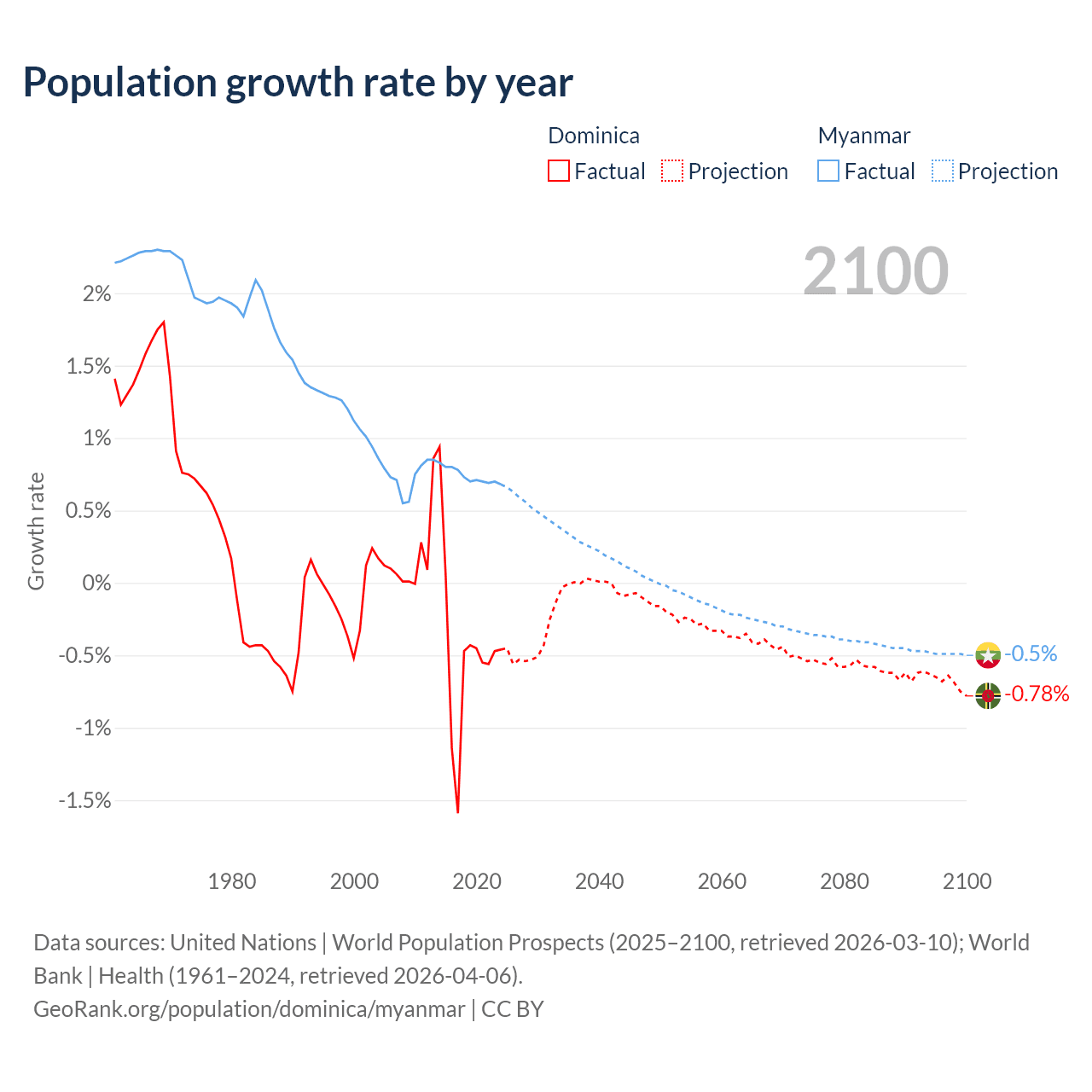 - For the last 10 years, Dominica has had an average growth rate of -0.47% per year vs +0.74% in Myanmar.