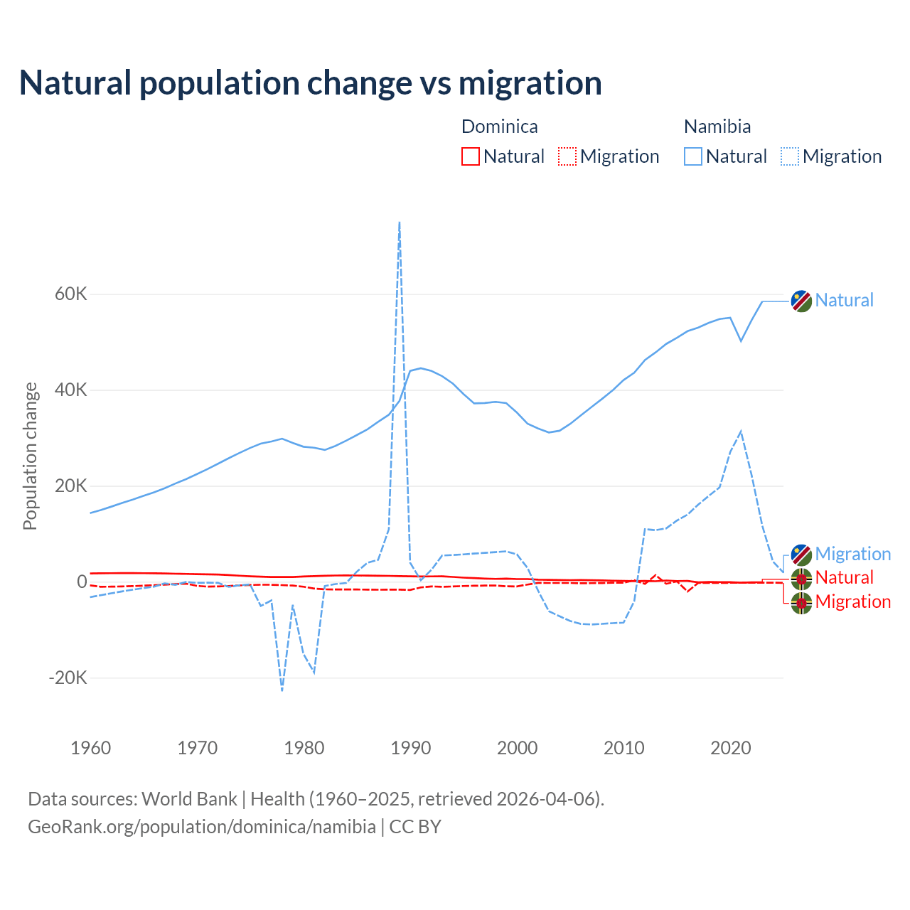 Over the last 10 years, 4.63% of the population change in Dominica is from natural causes (a loss of 190 people) and 95.4% is from migration (a loss of 3,914 people). In Namibia 74.3% is from natural causes (a gain of 532,532 people) and 25.7% is from migration (a gain of 183,837 people).