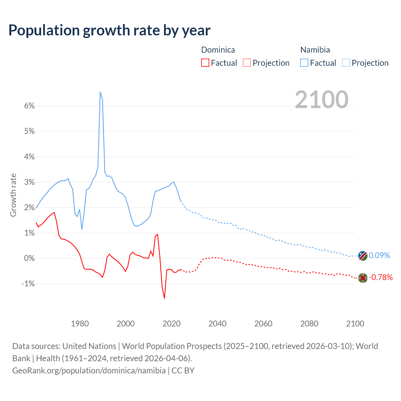 - For the last 10 years, Dominica has had an average growth rate of -0.47% per year vs +2.73% in Namibia.