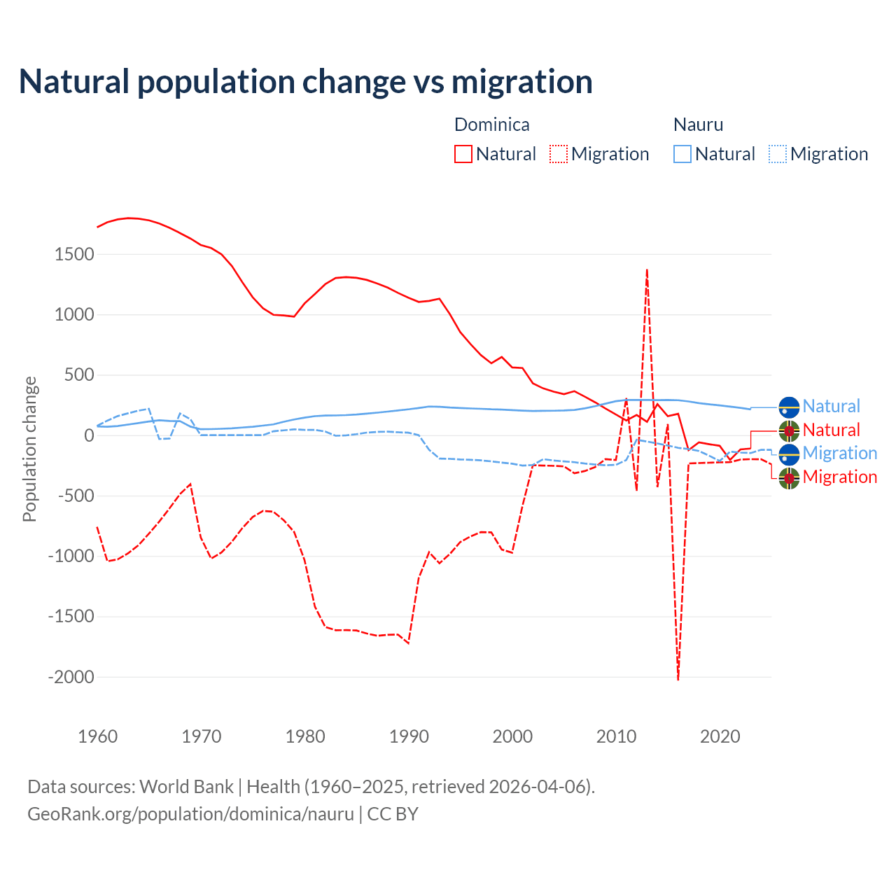 Over the last 10 years, 4.63% of the population change in Dominica is from natural causes (a loss of 190 people) and 95.4% is from migration (a loss of 3,914 people). In Nauru 66.2% is from natural causes (a gain of 2,590 people) and 33.8% is from migration (a loss of 1,320 people).