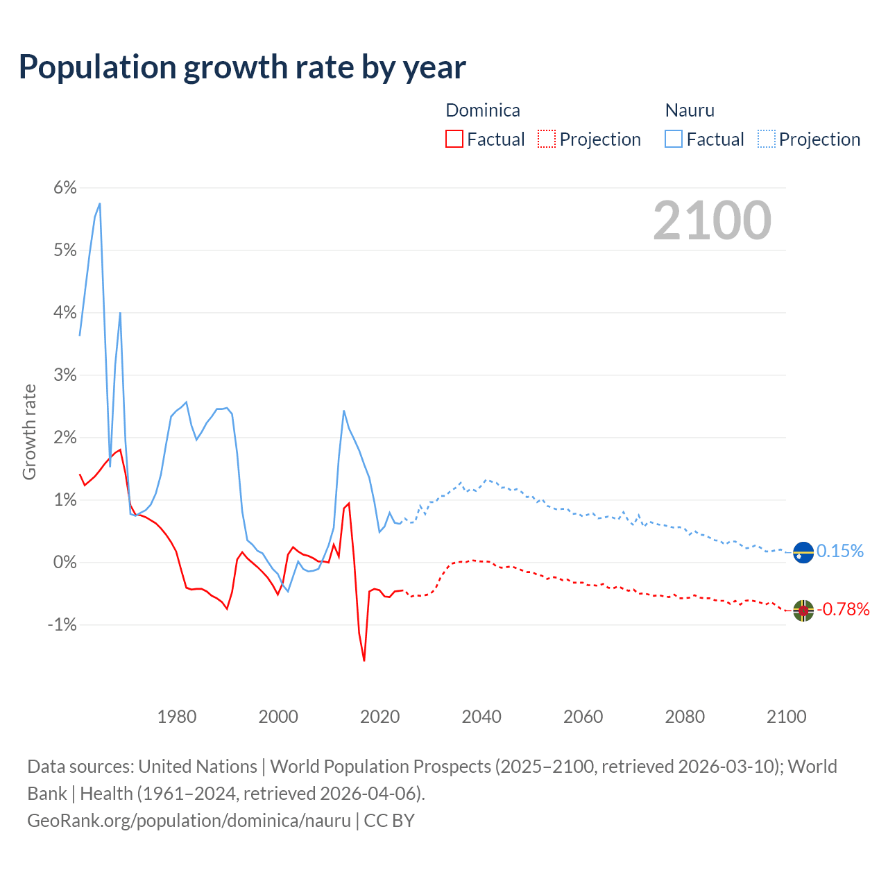 - For the last 10 years, Dominica has had an average growth rate of -0.47% per year vs +1.17% in Nauru.