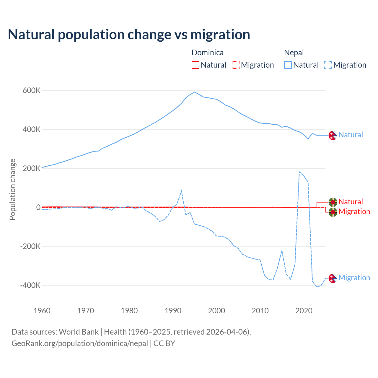 Over the last 10 years, 4.63% of the population change in Dominica is from natural causes (a loss of 190 people) and 95.4% is from migration (a loss of 3,914 people). In Nepal 67.9% is from natural causes (a gain of 3,909,749 people) and 32.1% is from migration (a loss of 1,851,664 people).