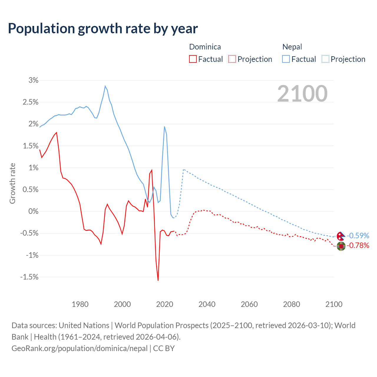 - For the last 10 years, Dominica has had an average growth rate of -0.47% per year vs +0.66% in Nepal.