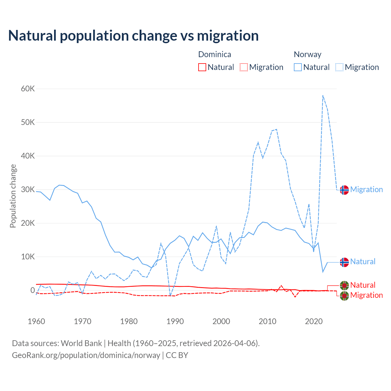 Over the last 10 years, 4.63% of the population change in Dominica is from natural causes (a loss of 190 people) and 95.4% is from migration (a loss of 3,914 people). In Norway 31.3% is from natural causes (a gain of 138,699 people) and 68.7% is from migration (a gain of 303,945 people).
