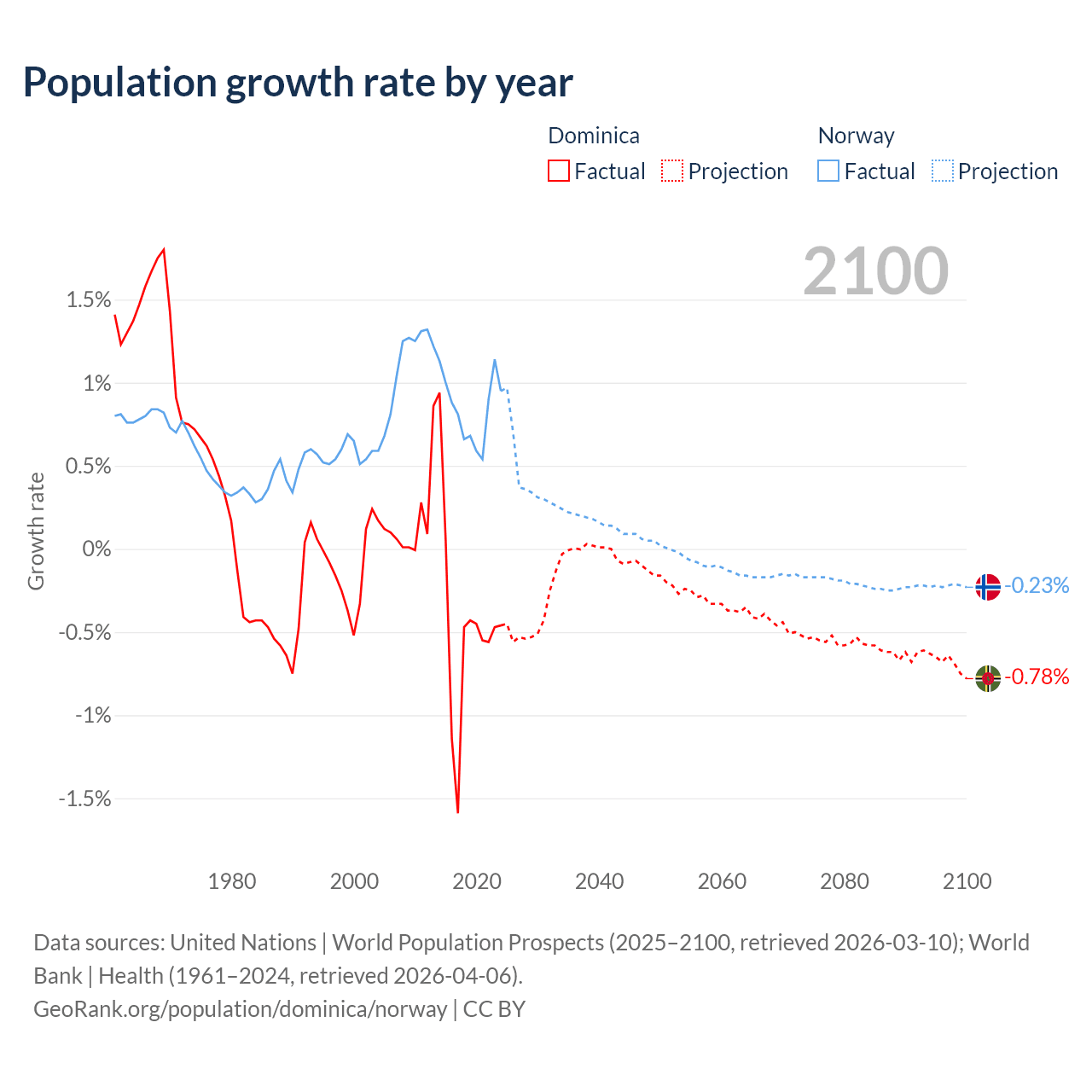 - For the last 10 years, Dominica has had an average growth rate of -0.47% per year vs +0.85% in Norway.