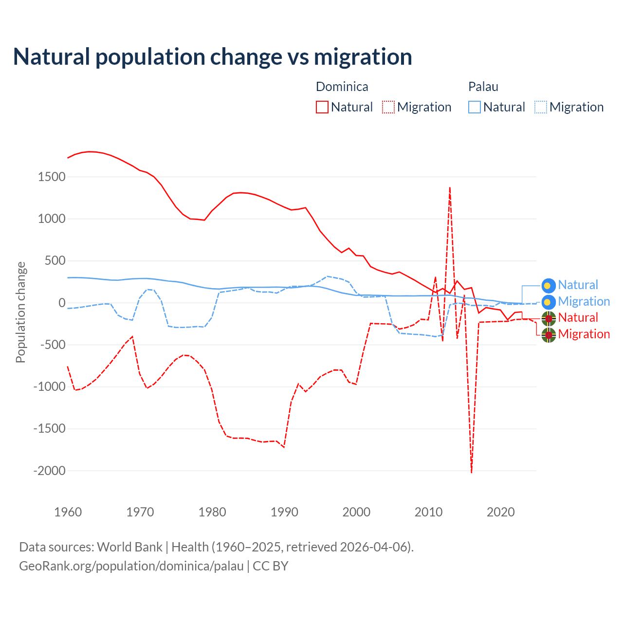 Over the last 10 years, 4.63% of the population change in Dominica is from natural causes (a loss of 190 people) and 95.4% is from migration (a loss of 3,914 people). In Palau 53.8% is from natural causes (a gain of 264 people) and 46.2% is from migration (a loss of 227 people).