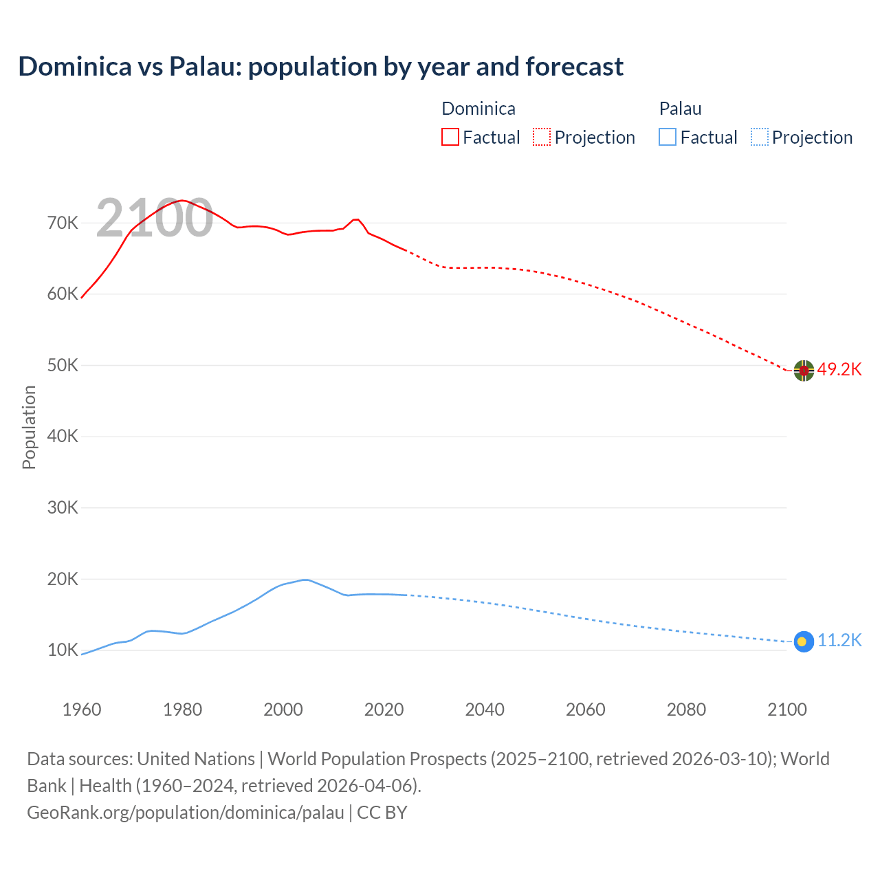 The latest officially reported population of Dominica was 66,205 in 2024 vs 17,695 people in Palau in 2024. In 2026, based on the adjusted UN estimation, the current Dominica's population is 65,539 people compared to 17,629 in Palau.