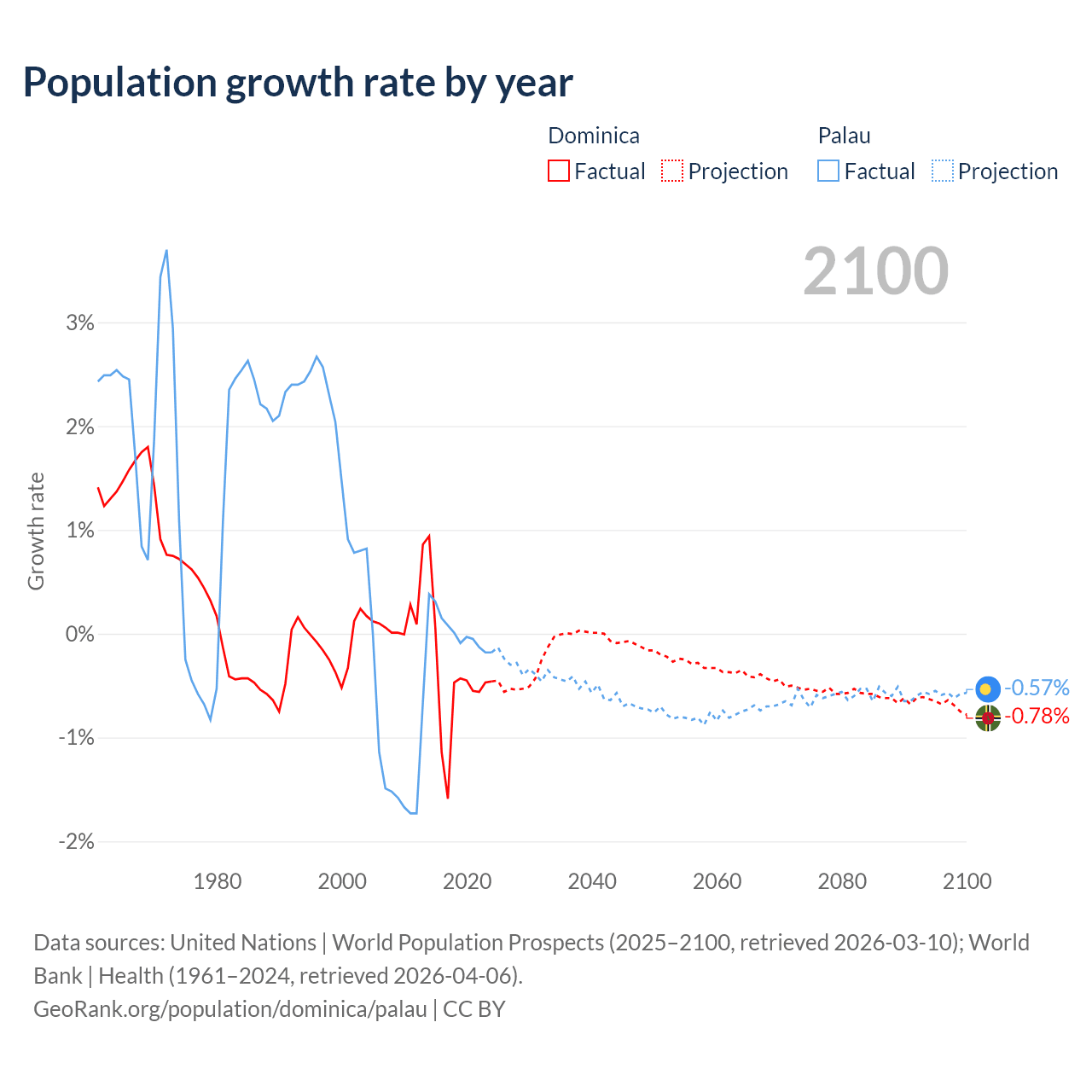 - For the last 10 years, Dominica has had an average growth rate of -0.47% per year vs +0.02% in Palau.