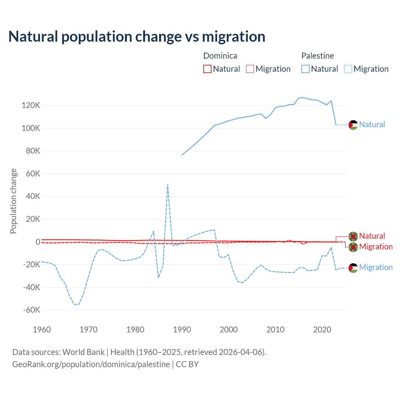 Over the last 10 years, 4.63% of the population change in Dominica is from natural causes (a loss of 190 people) and 95.4% is from migration (a loss of 3,914 people). In Palestine 85.7% is from natural causes (a gain of 1,218,010 people) and 14.3% is from migration (a loss of 202,820 people).