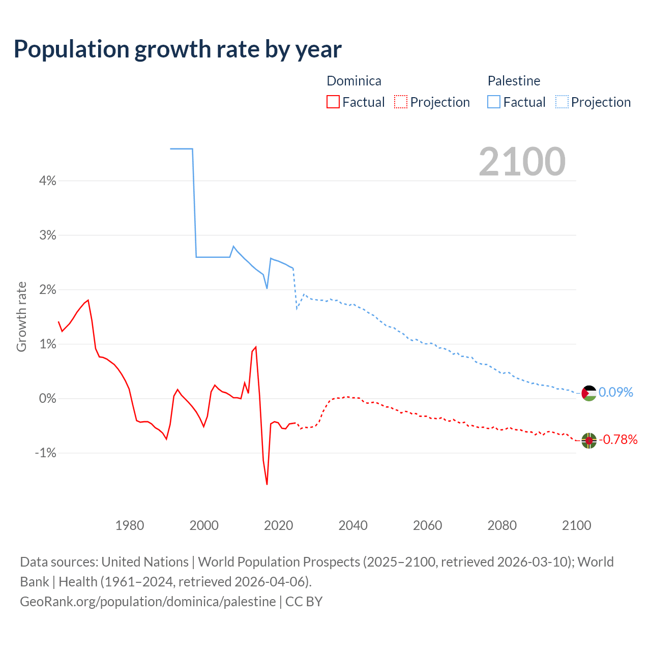 - For the last 10 years, Dominica has had an average growth rate of -0.47% per year vs +2.4% in Palestine.
