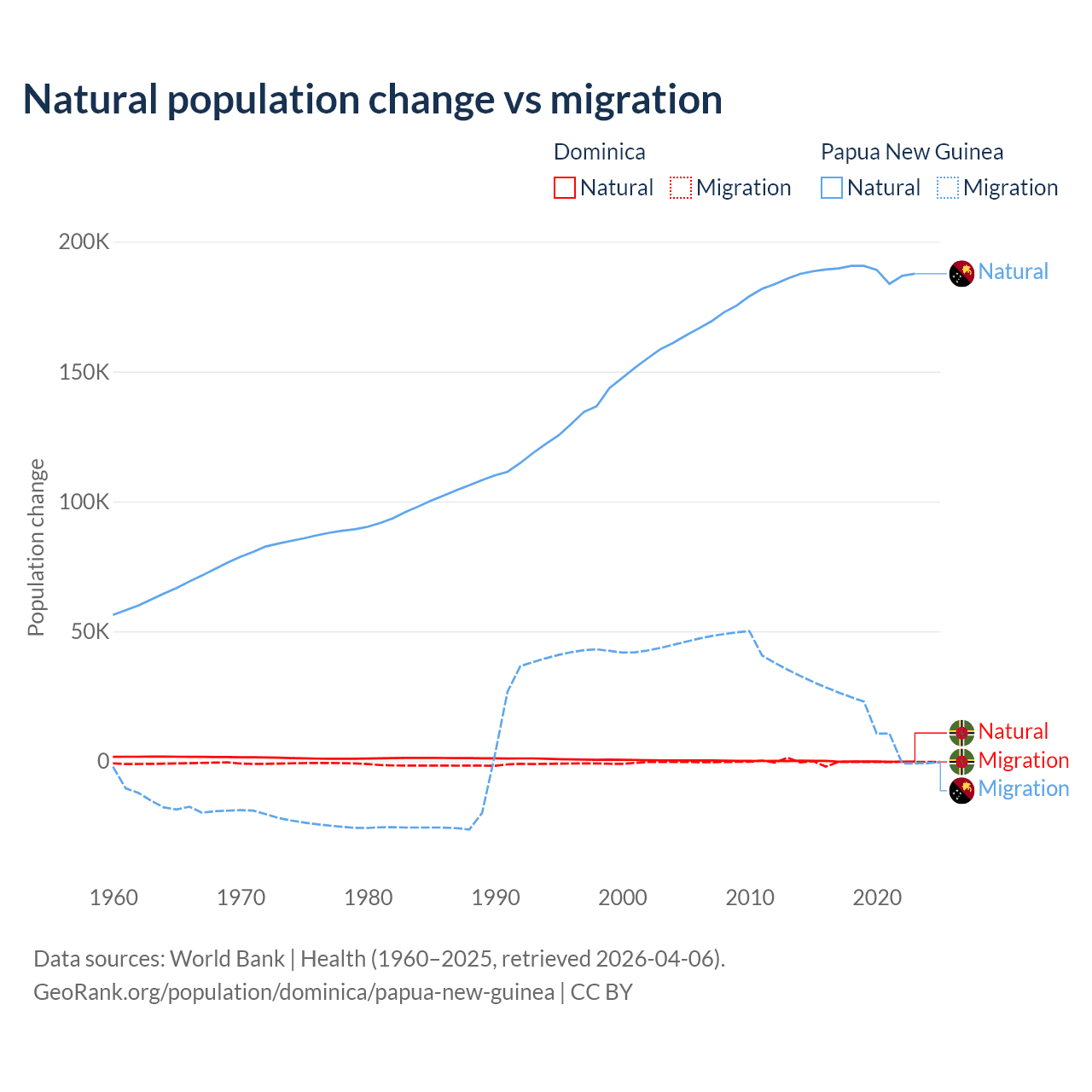 Over the last 10 years, 4.63% of the population change in Dominica is from natural causes (a loss of 190 people) and 95.4% is from migration (a loss of 3,914 people). In Papua New Guinea 91% is from natural causes (a gain of 1,883,906 people) and 8.98% is from migration (a gain of 185,900 people).