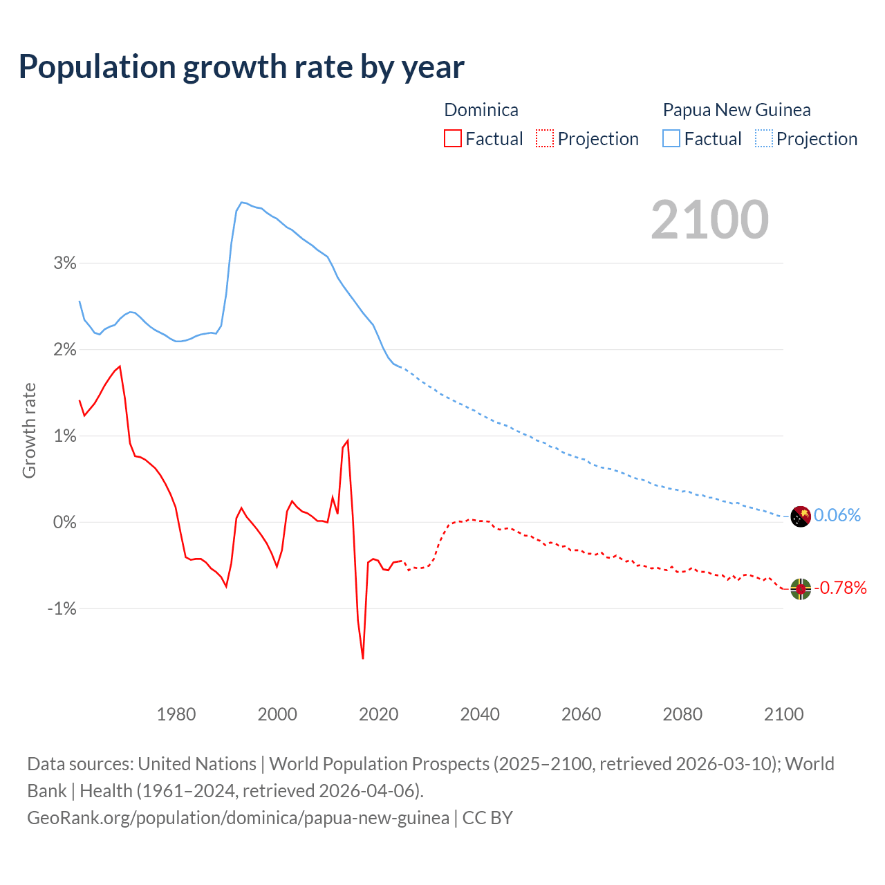 - For the last 10 years, Dominica has had an average growth rate of -0.47% per year vs +2.23% in Papua New Guinea.