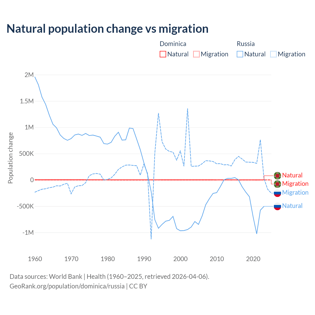 Over the last 10 years, 4.63% of the population change in Dominica is from natural causes (a loss of 190 people) and 95.4% is from migration (a loss of 3,914 people). In Russia 48.6% is from natural causes (a loss of 3,416,377 people) and 51.4% is from migration (a gain of 3,611,826 people).