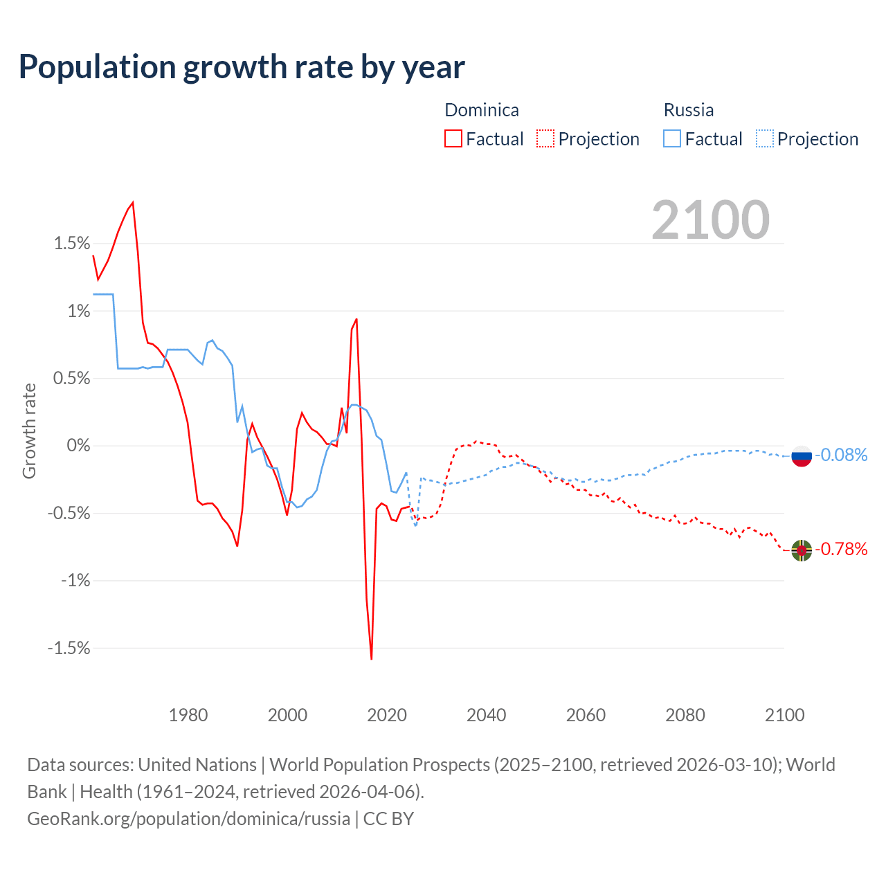 - For the last 10 years, Dominica has had an average growth rate of -0.47% per year vs -0.02% in Russia.