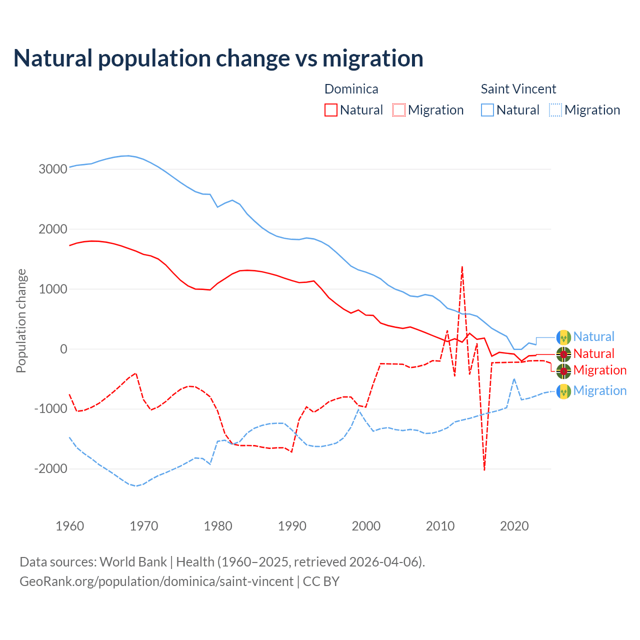 Over the last 10 years, 4.63% of the population change in Dominica is from natural causes (a loss of 190 people) and 95.4% is from migration (a loss of 3,914 people). In Saint Vincent 21.2% is from natural causes (a gain of 2,525 people) and 78.8% is from migration (a loss of 9,393 people).