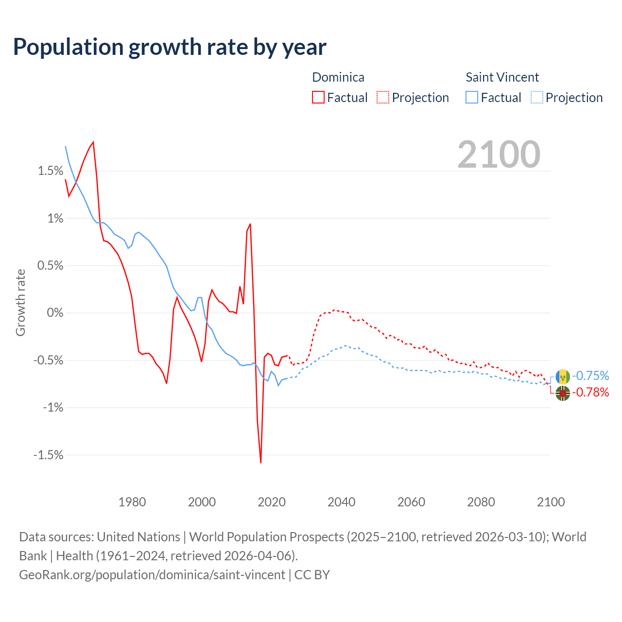 - For the last 10 years, Dominica has had an average growth rate of -0.47% per year vs -0.65% in Saint Vincent.