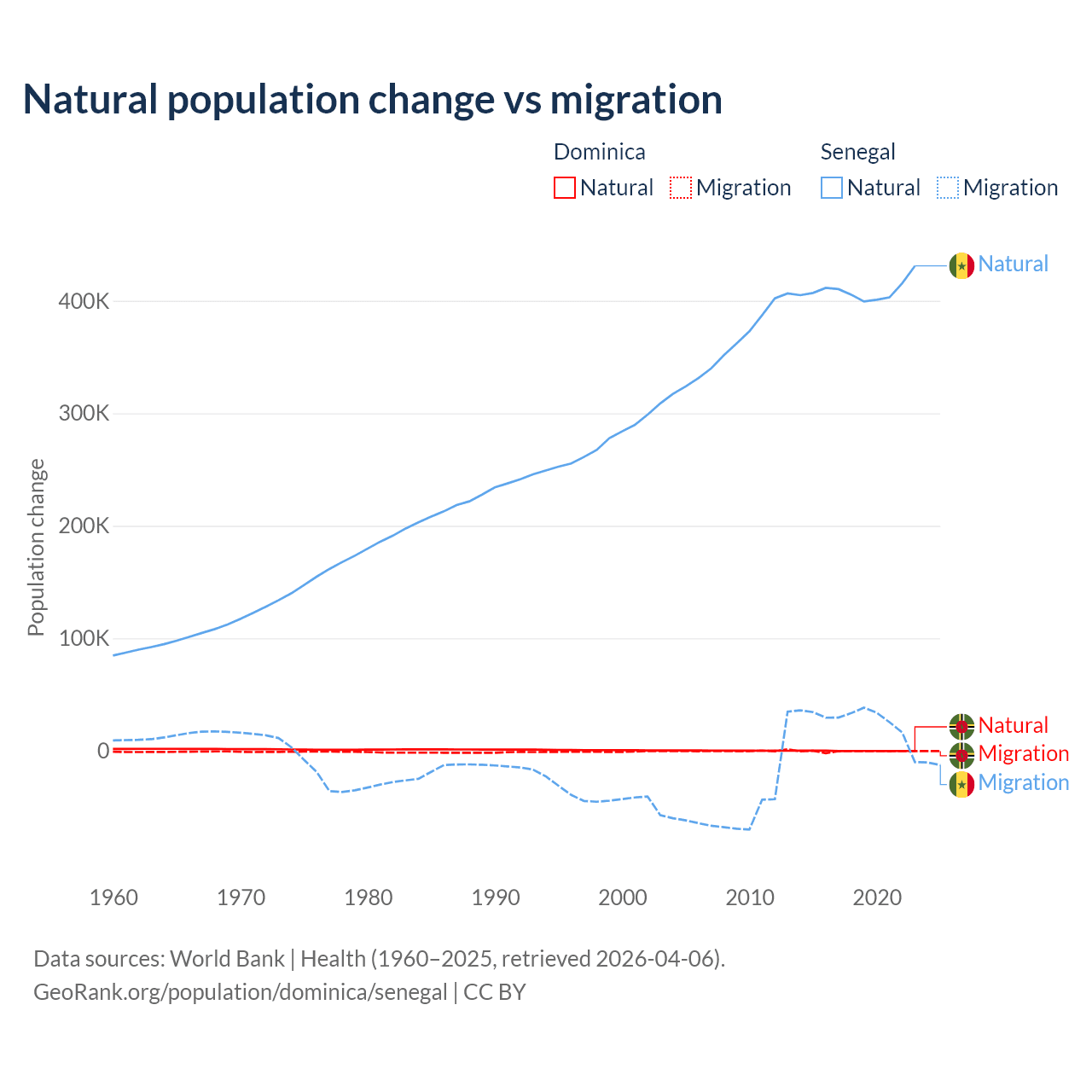 Over the last 10 years, 4.63% of the population change in Dominica is from natural causes (a loss of 190 people) and 95.4% is from migration (a loss of 3,914 people). In Senegal 93.9% is from natural causes (a gain of 4,089,205 people) and 6.13% is from migration (a gain of 267,266 people).