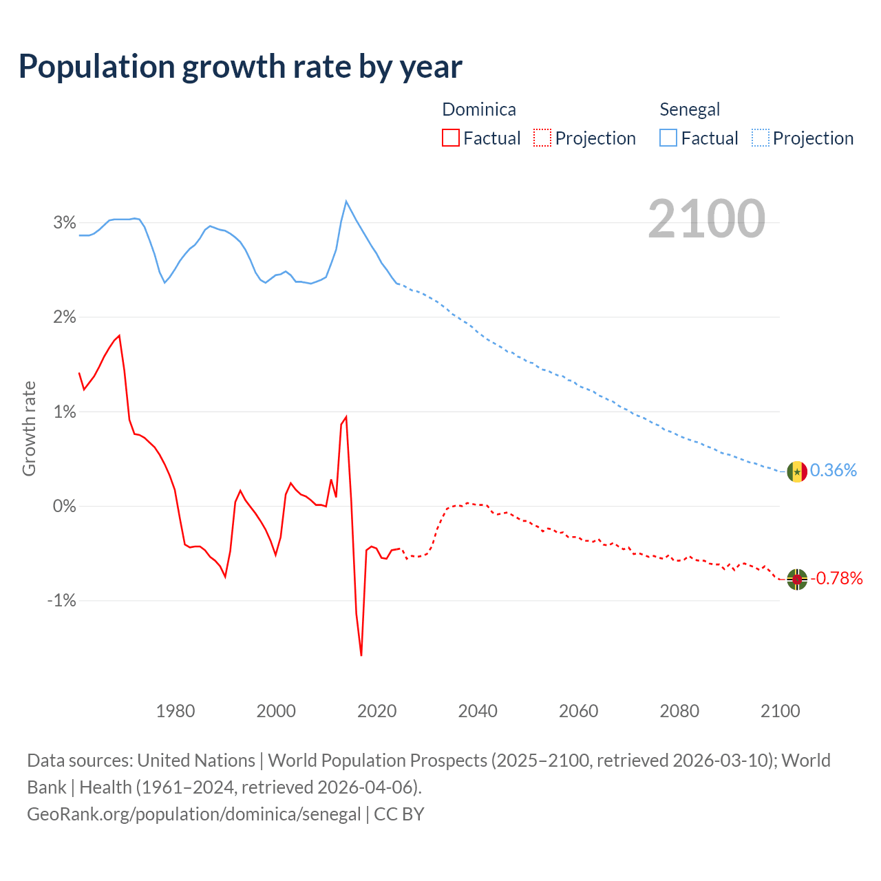 - For the last 10 years, Dominica has had an average growth rate of -0.47% per year vs +2.76% in Senegal.