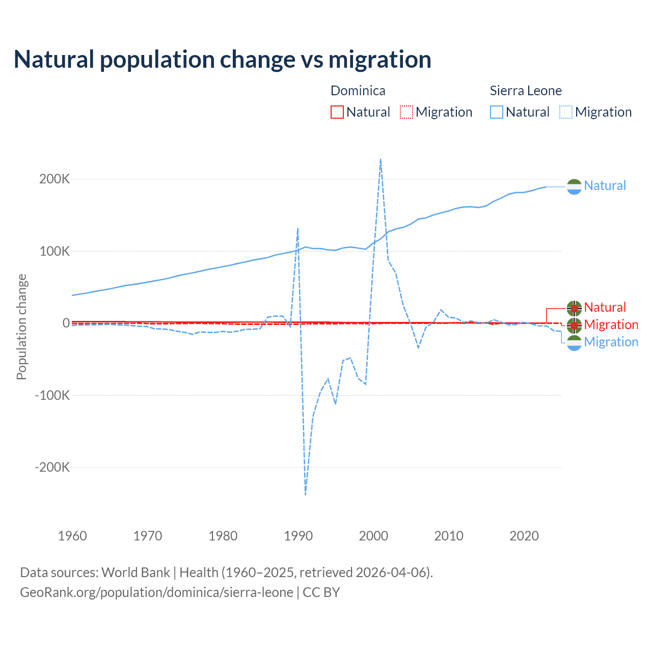 Over the last 10 years, 4.63% of the population change in Dominica is from natural causes (a loss of 190 people) and 95.4% is from migration (a loss of 3,914 people). In Sierra Leone 99.6% is from natural causes (a gain of 1,764,049 people) and 0.41% is from migration (a loss of 7,211 people).