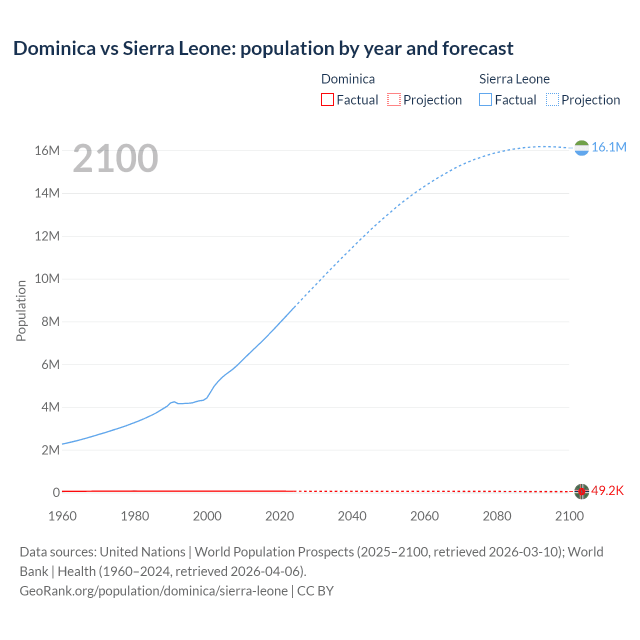 The latest officially reported population of Dominica was 66,205 in 2024 vs 8,642,022 people in Sierra Leone in 2024. In 2026, based on the adjusted UN estimation, the current Dominica's population is 65,539 people compared to 9,049,533 in Sierra Leone.