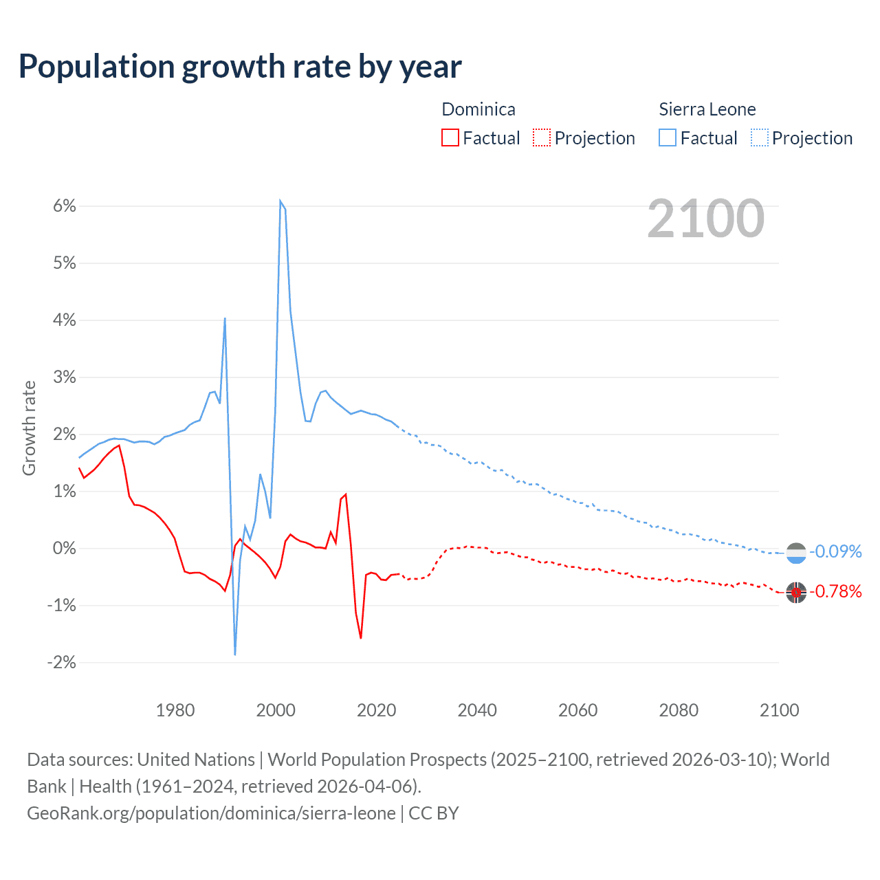 - For the last 10 years, Dominica has had an average growth rate of -0.47% per year vs +2.32% in Sierra Leone.