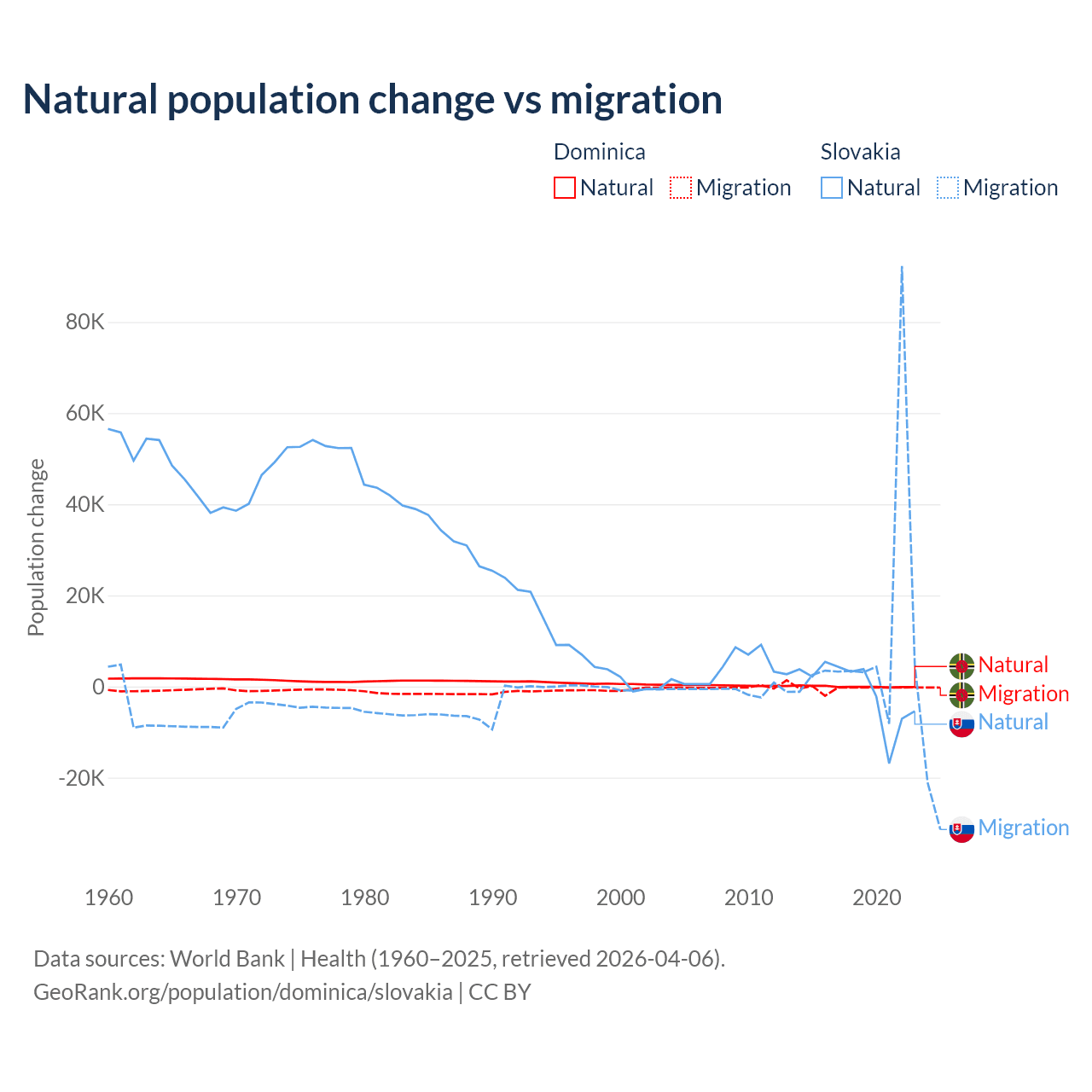 Over the last 10 years, 4.63% of the population change in Dominica is from natural causes (a loss of 190 people) and 95.4% is from migration (a loss of 3,914 people). In Slovakia 7.47% is from natural causes (a loss of 8,728 people) and 92.5% is from migration (a gain of 108,156 people).