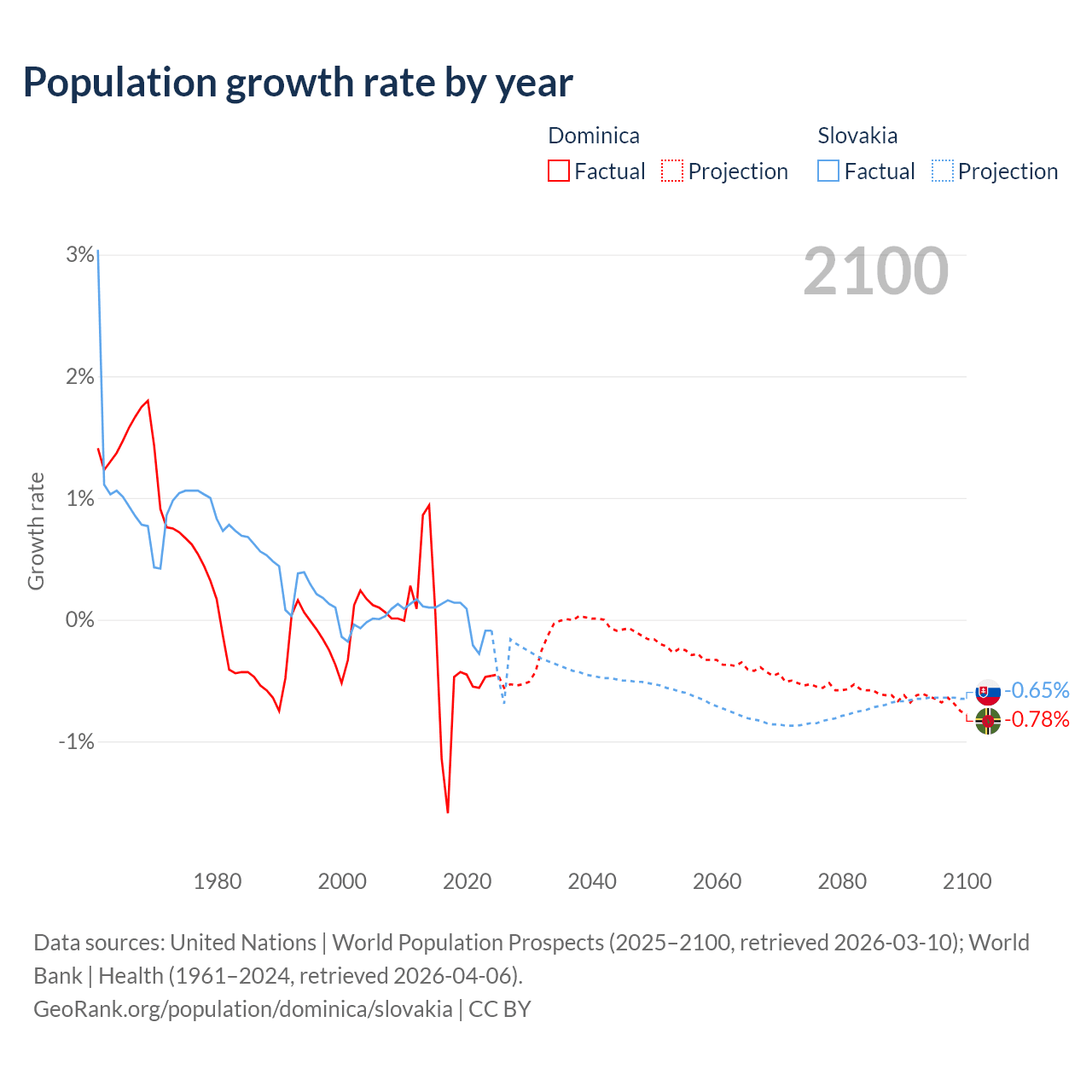 - For the last 10 years, Dominica has had an average growth rate of -0.47% per year vs +0.01% in Slovakia.