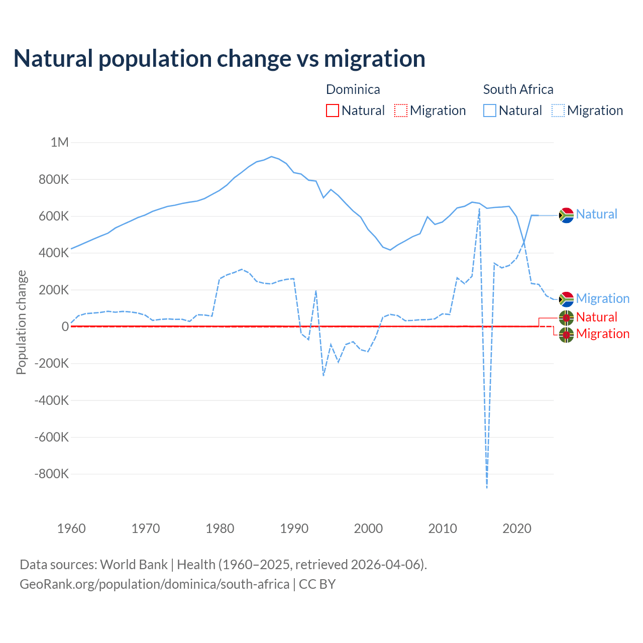 Over the last 10 years, 4.63% of the population change in Dominica is from natural causes (a loss of 190 people) and 95.4% is from migration (a loss of 3,914 people). In South Africa 72.8% is from natural causes (a gain of 6,190,027 people) and 27.2% is from migration (a gain of 2,316,795 people).