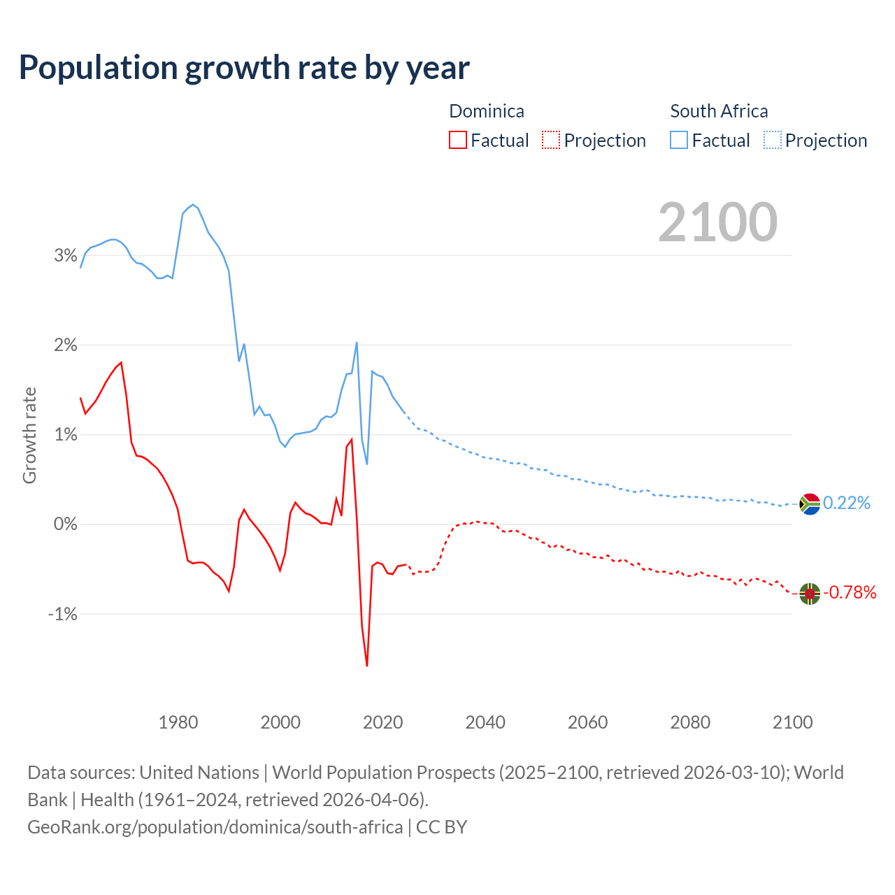 - For the last 10 years, Dominica has had an average growth rate of -0.47% per year vs +1.44% in South Africa.