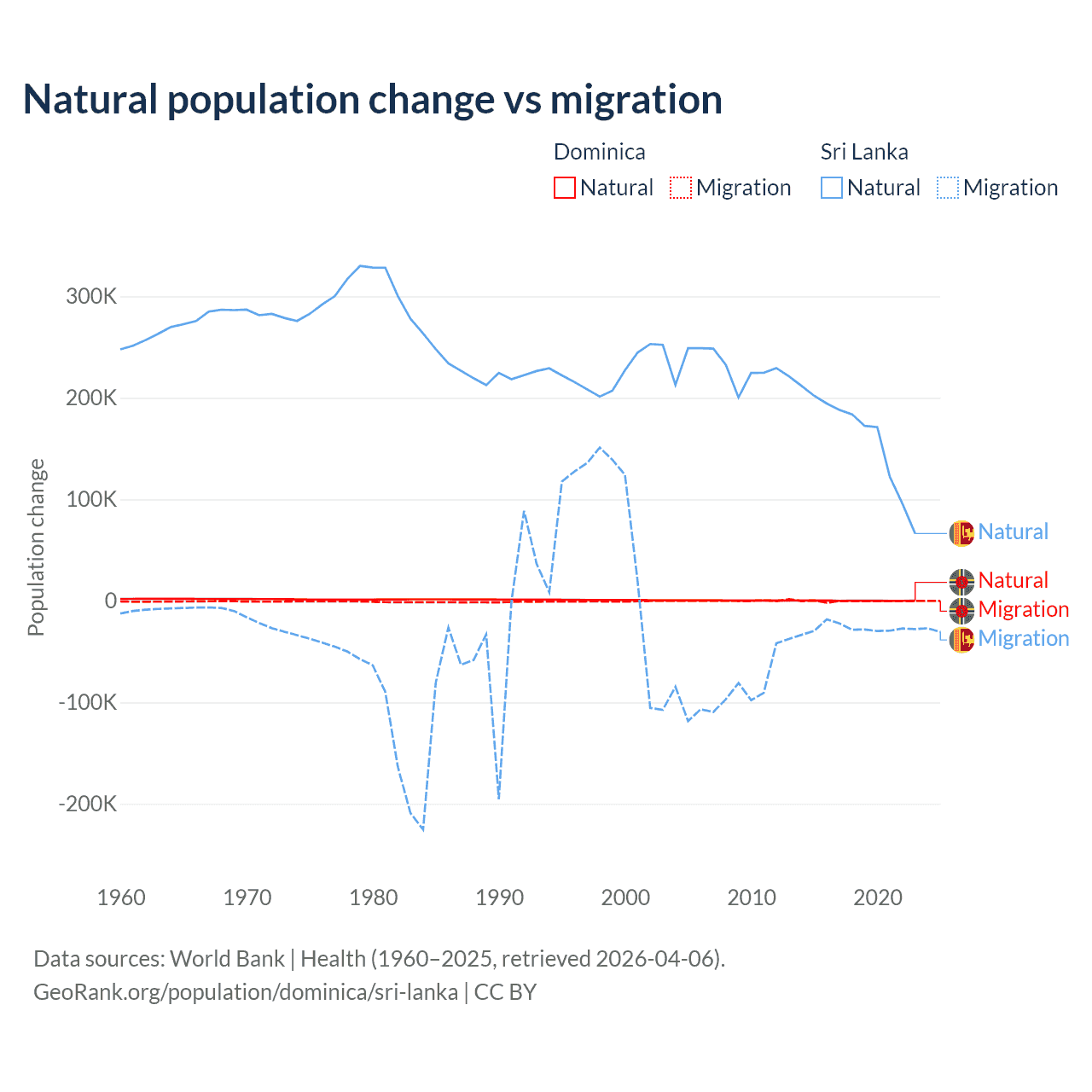 Over the last 10 years, 4.63% of the population change in Dominica is from natural causes (a loss of 190 people) and 95.4% is from migration (a loss of 3,914 people). In Sri Lanka 85.3% is from natural causes (a gain of 1,605,749 people) and 14.7% is from migration (a loss of 276,121 people).