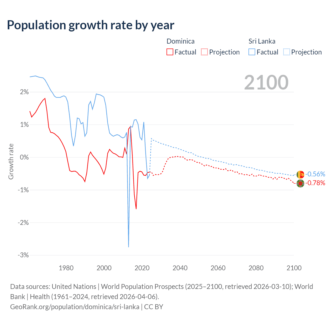 - For the last 10 years, Dominica has had an average growth rate of -0.47% per year vs +0.57% in Sri Lanka.