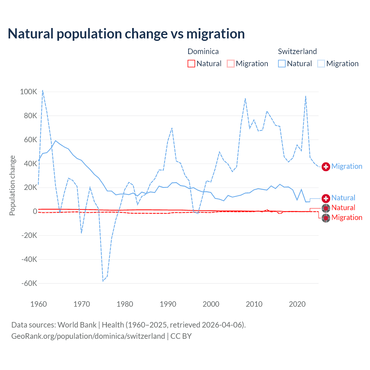 Over the last 10 years, 4.63% of the population change in Dominica is from natural causes (a loss of 190 people) and 95.4% is from migration (a loss of 3,914 people). In Switzerland 21.6% is from natural causes (a gain of 165,354 people) and 78.4% is from migration (a gain of 600,145 people).