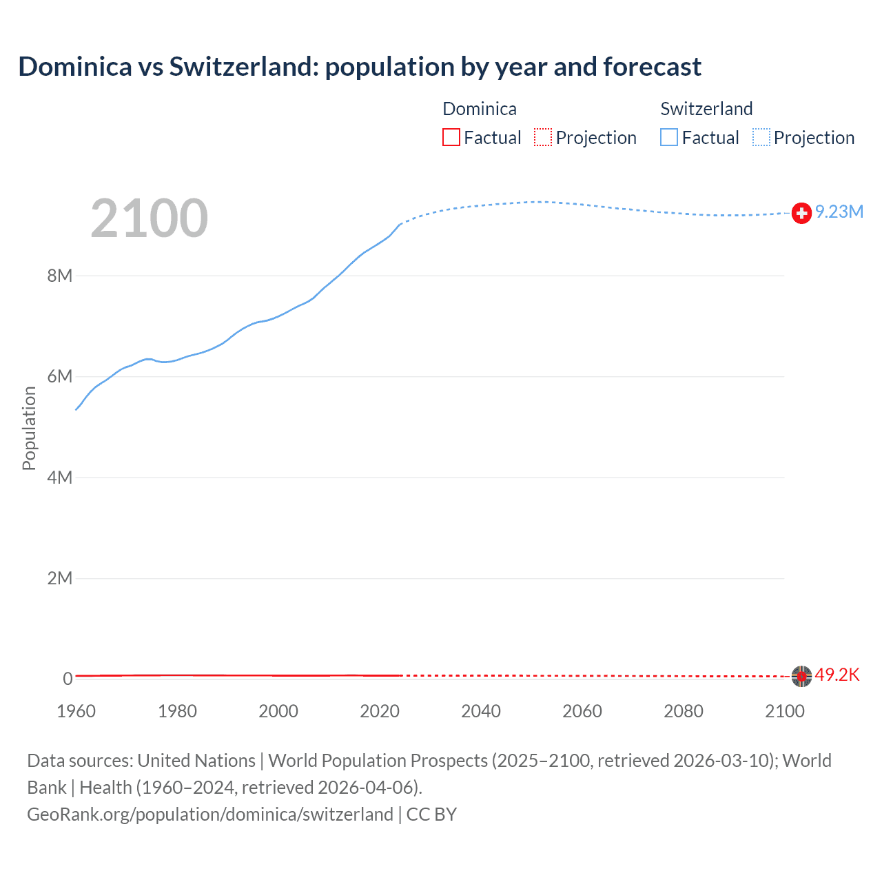 The latest officially reported population of Dominica was 66,205 in 2024 vs 9,005,582 people in Switzerland in 2024. In 2026, based on the adjusted UN estimation, the current Dominica's population is 65,539 people compared to 9,107,866 in Switzerland.