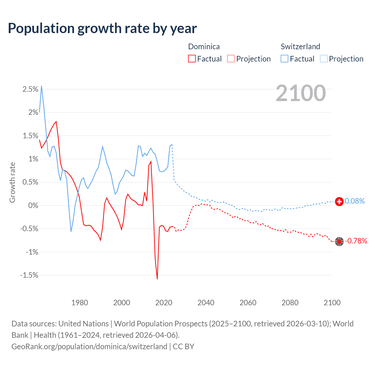 - For the last 10 years, Dominica has had an average growth rate of -0.47% per year vs +0.98% in Switzerland.